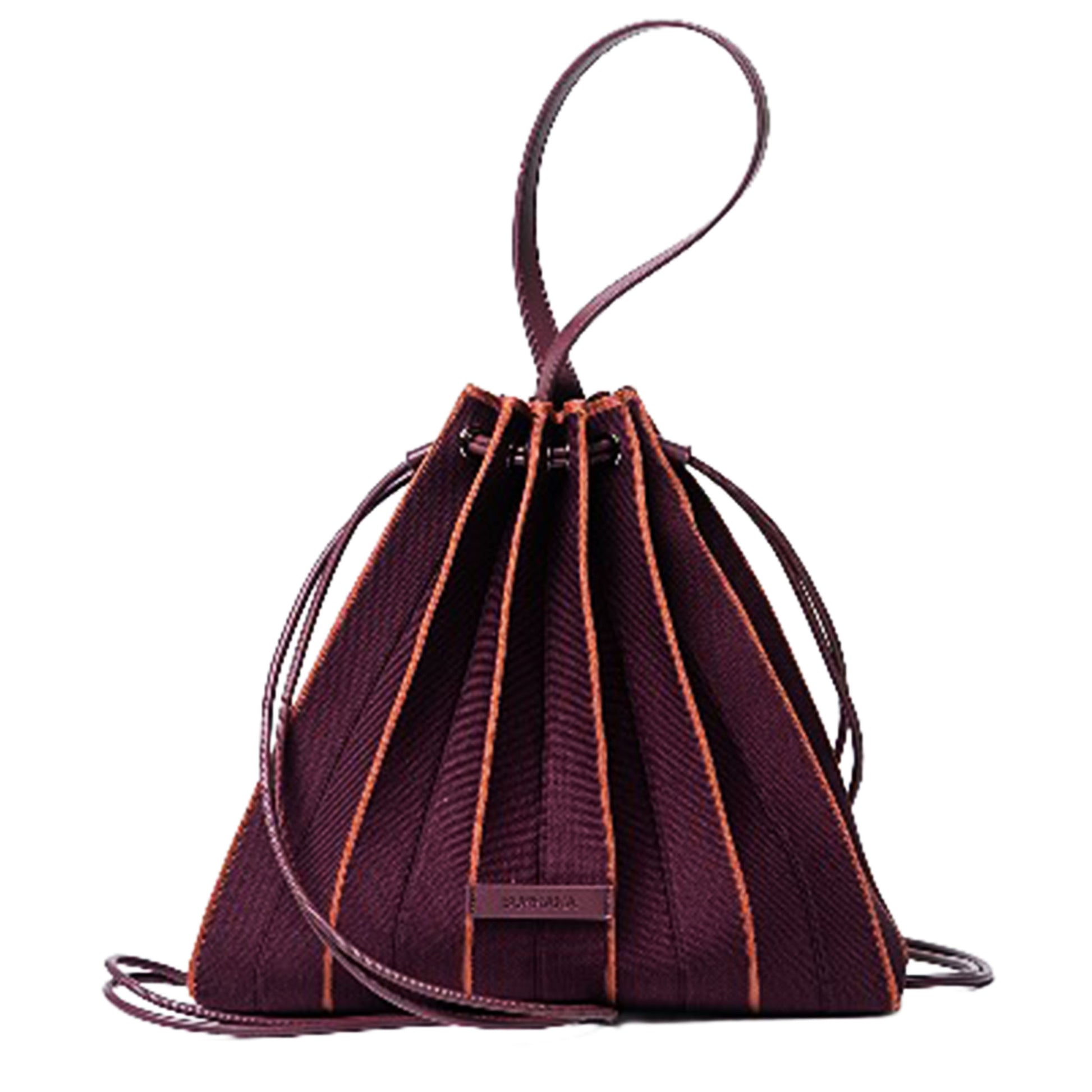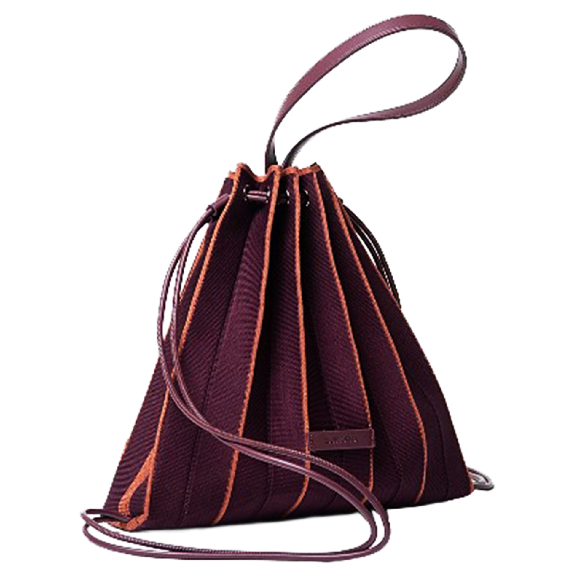 Zaino-borsa lavorato a maglia con texture plissettata e un design triangolare molto particolare. La chiusura è realizzata con cordoncini che scorrono attraverso occhielli, consentendo di regolarla facilmente tirando le cinghie. Include una pratica borsetta da toeletta