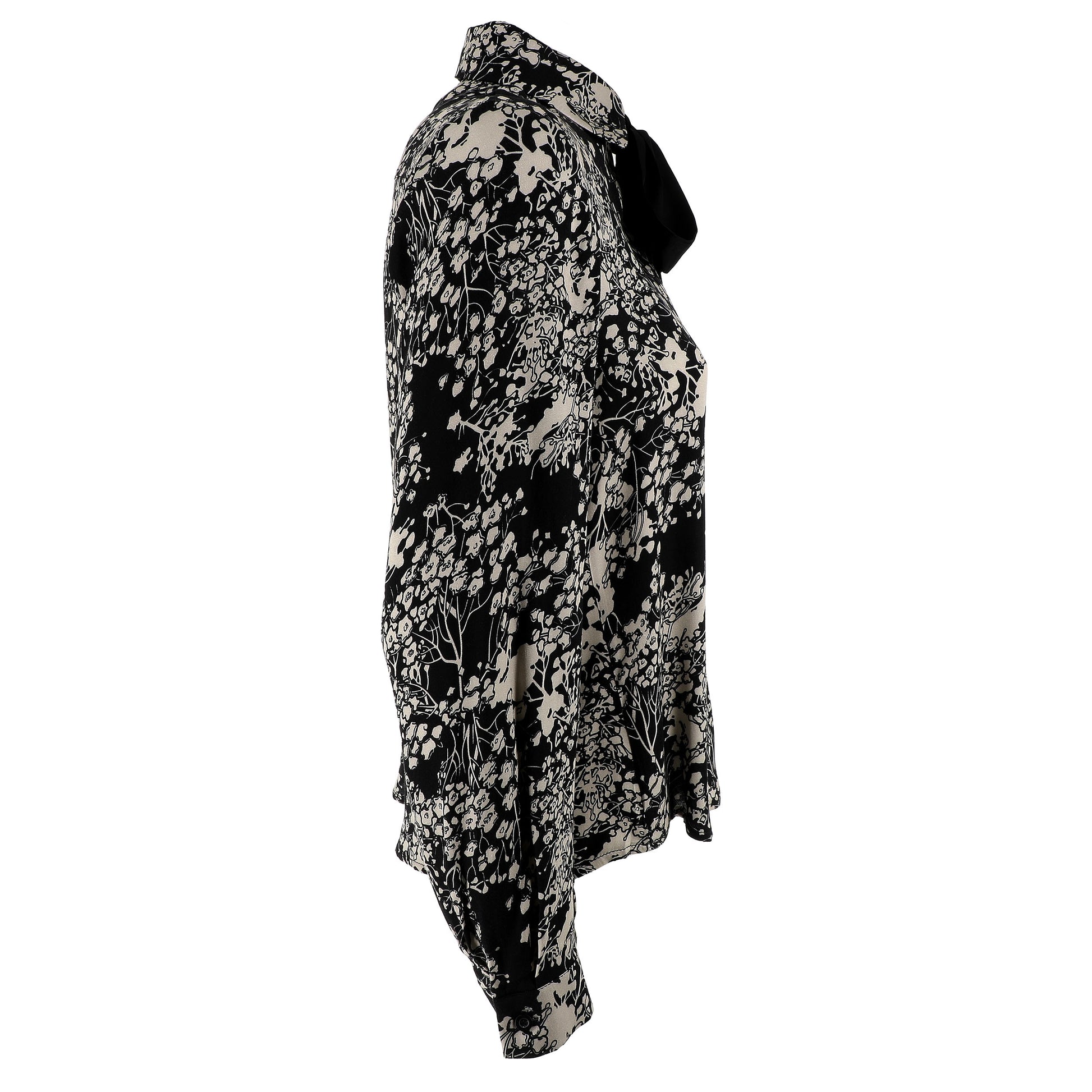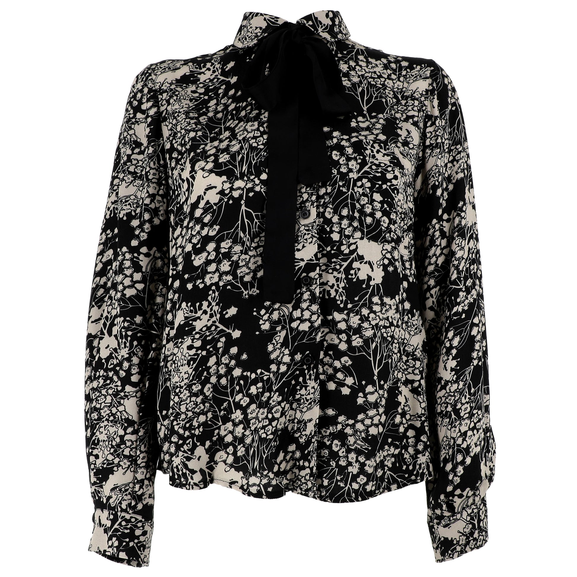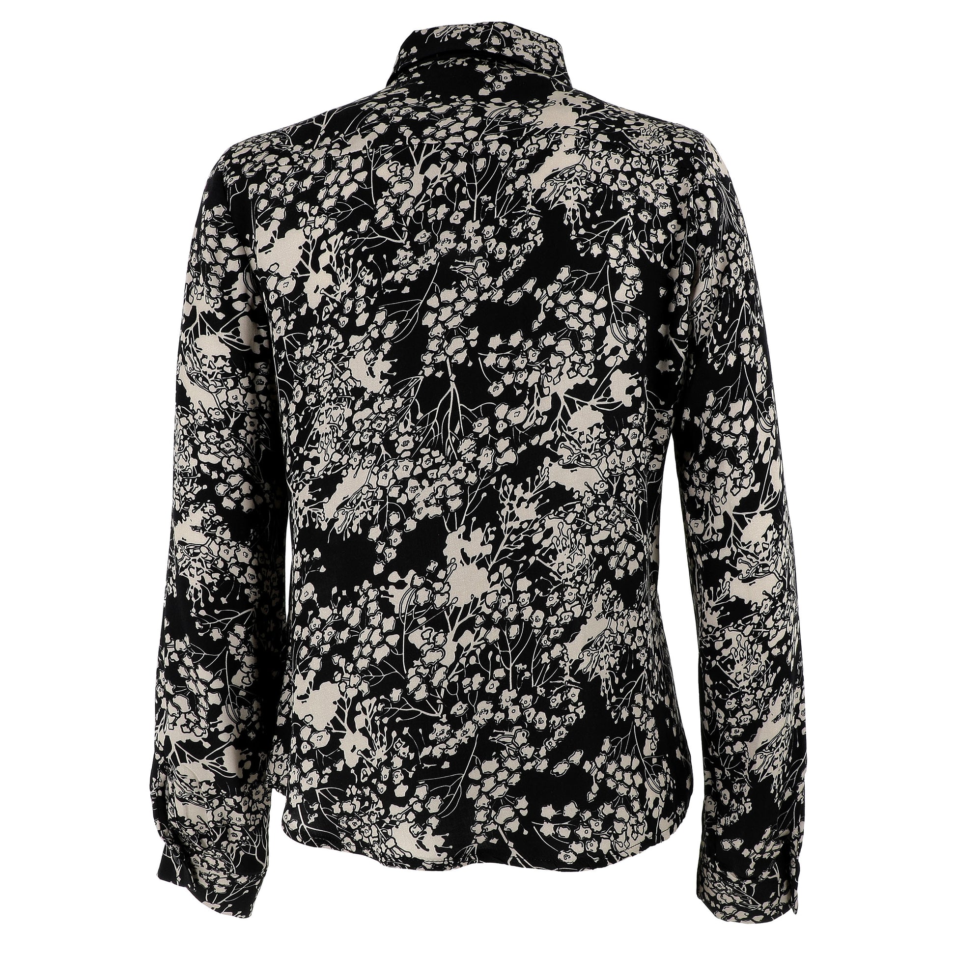 Camicia in viscosa stampata con bottoncini davanti e colletto stondato. Carré con piega e cannoncino dietro. Maniche lunghe con polsino e bottone. Taschino aperto sul davanti e cravattina a contrasto.
