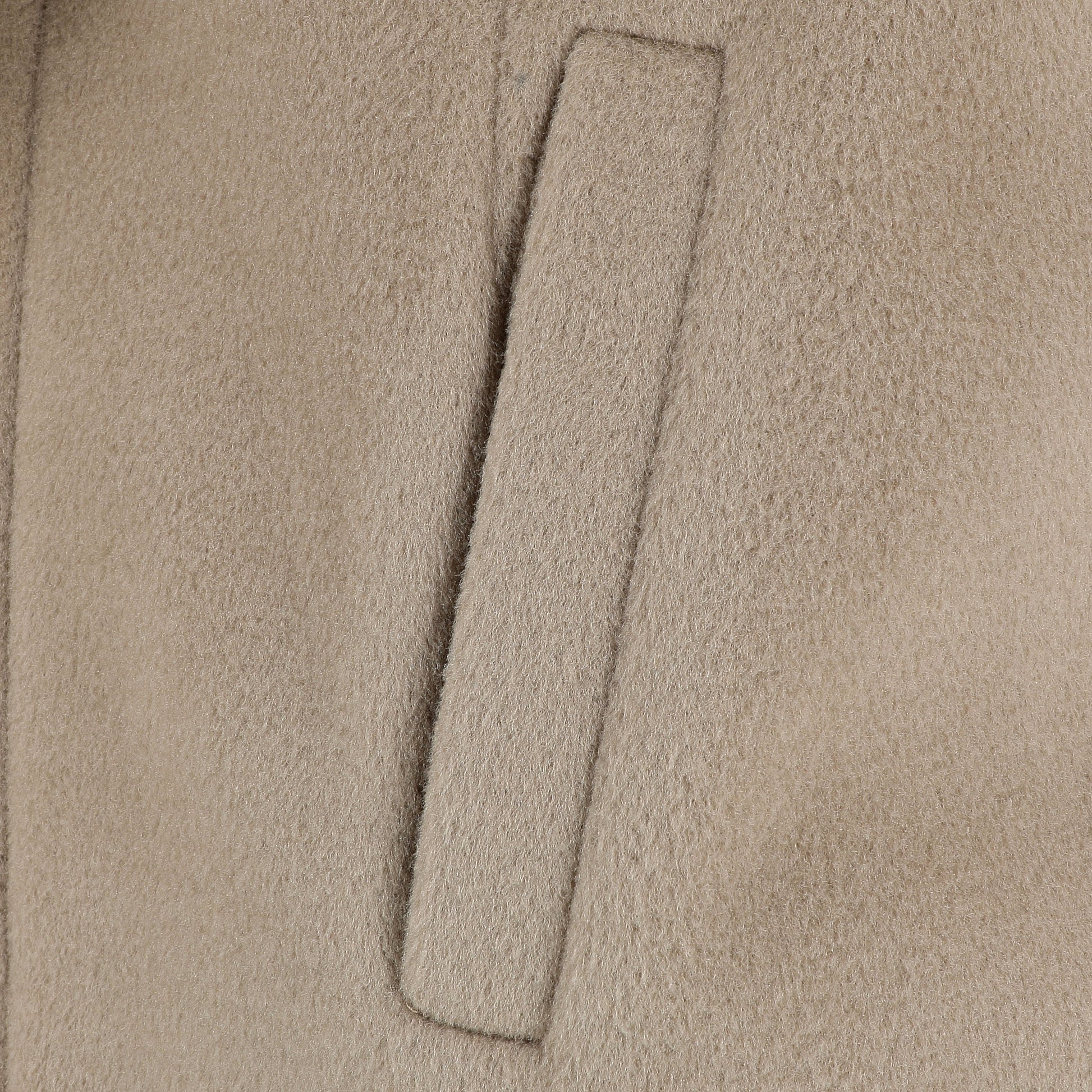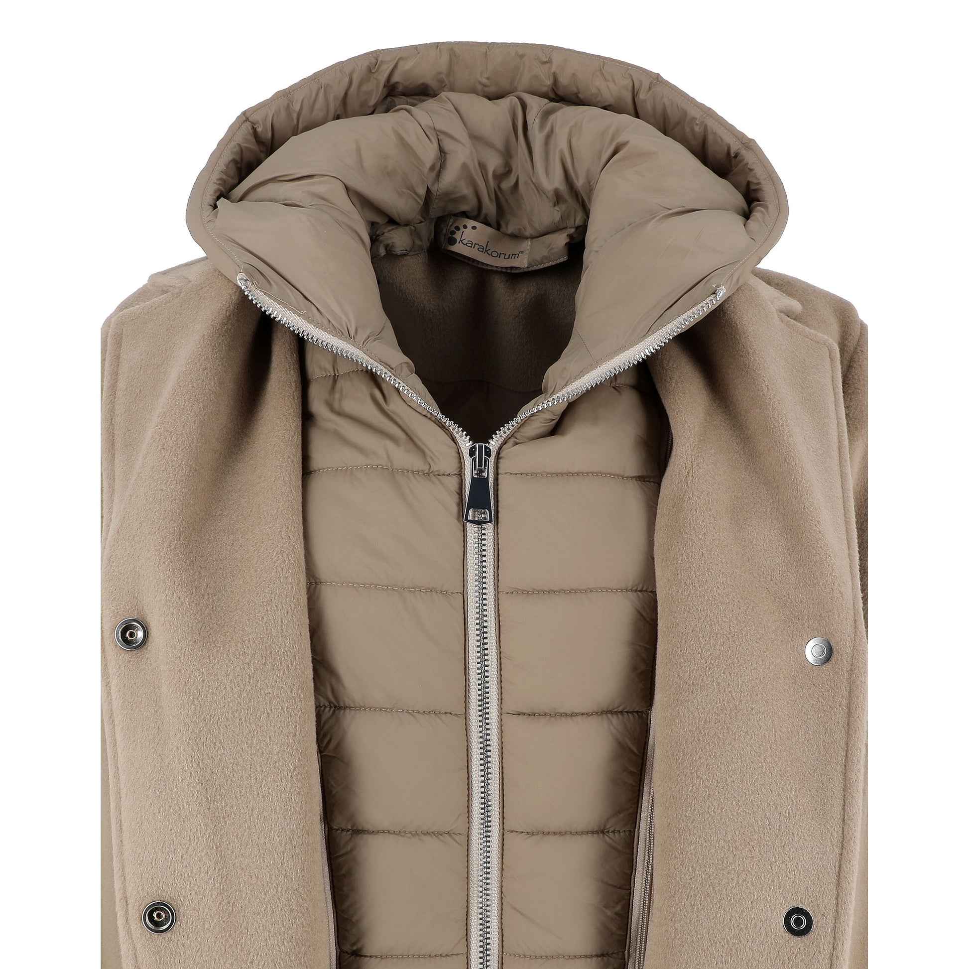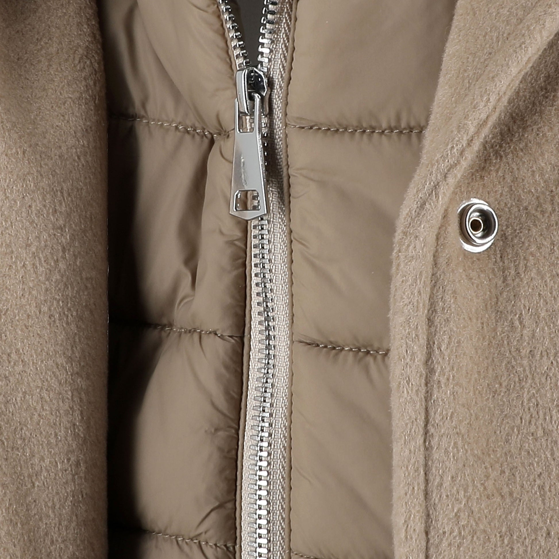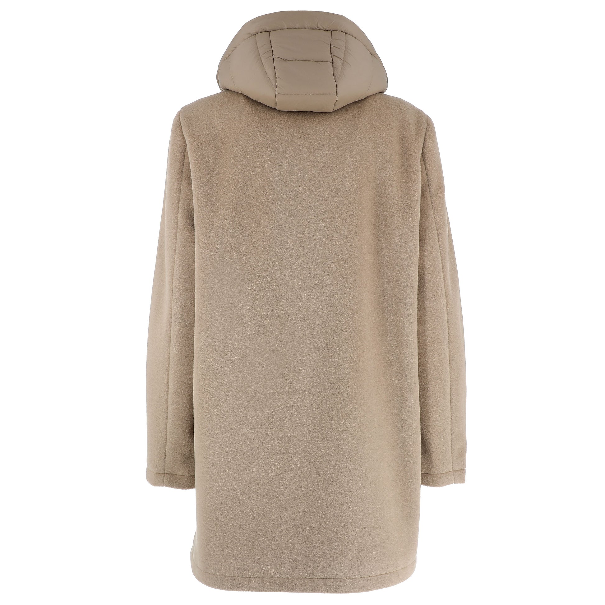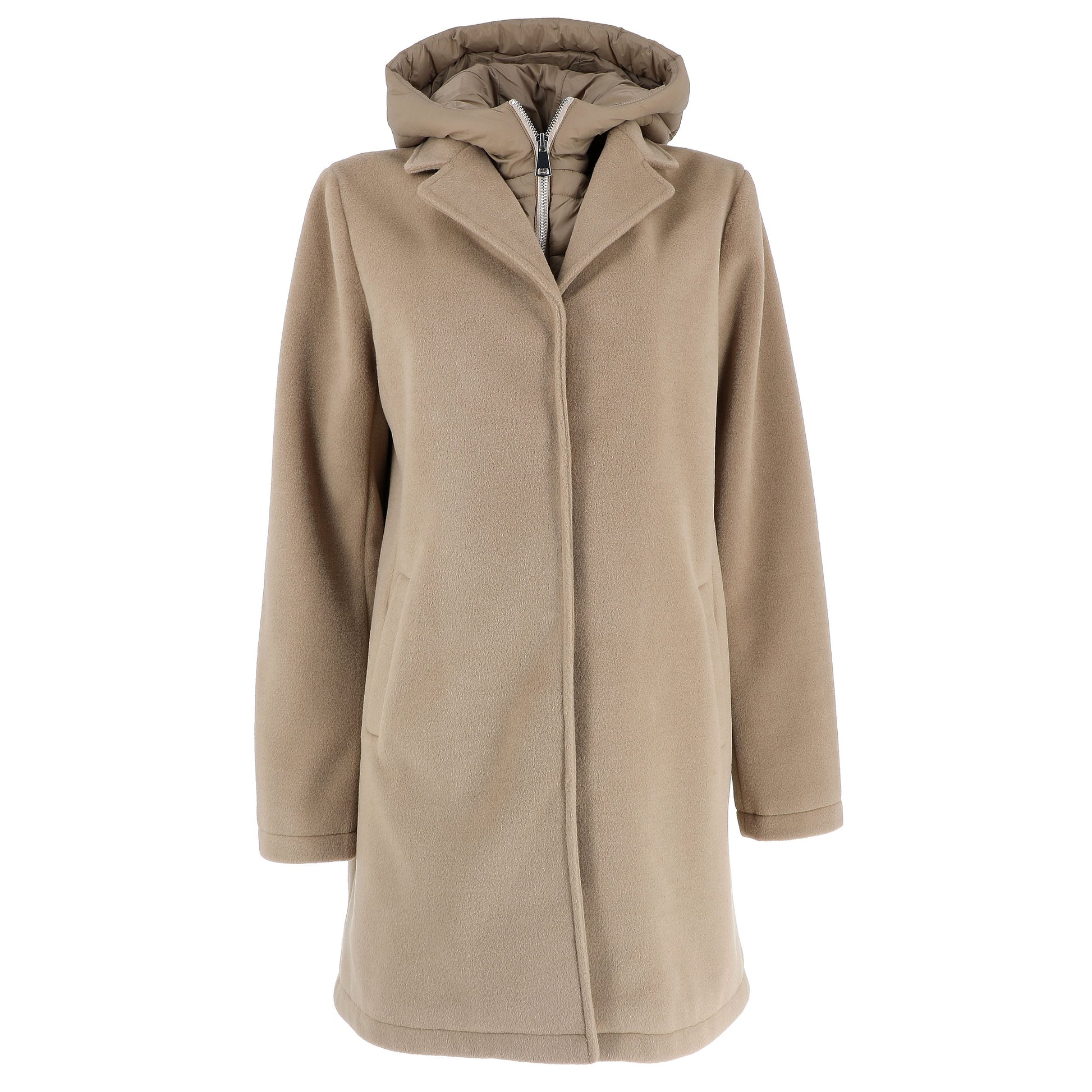 Cappotto di media lunghezza, double front in soffice panno, con pettorina e cappuccio imbottiti, removibili. Dotato di due pratiche tasche laterali inserite.