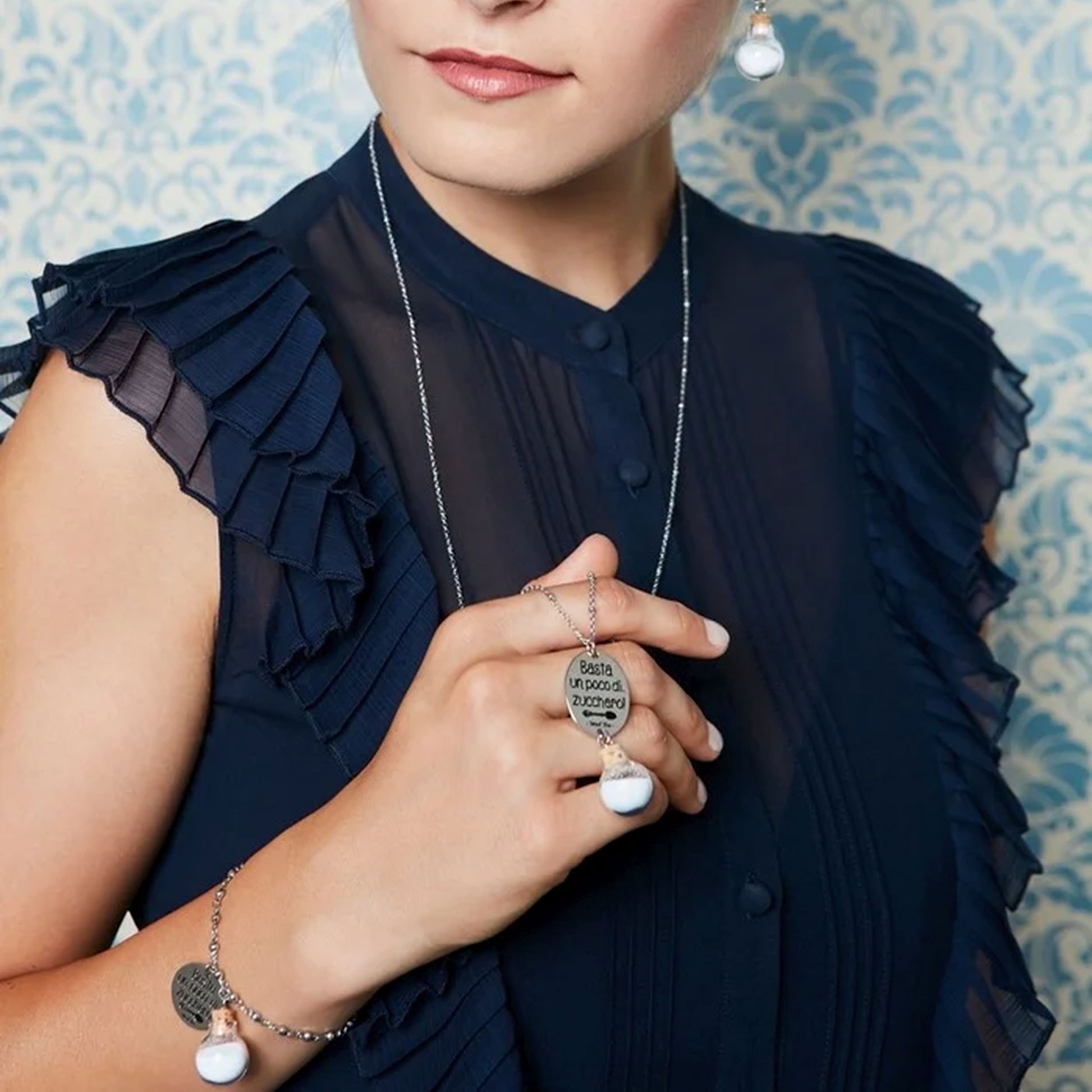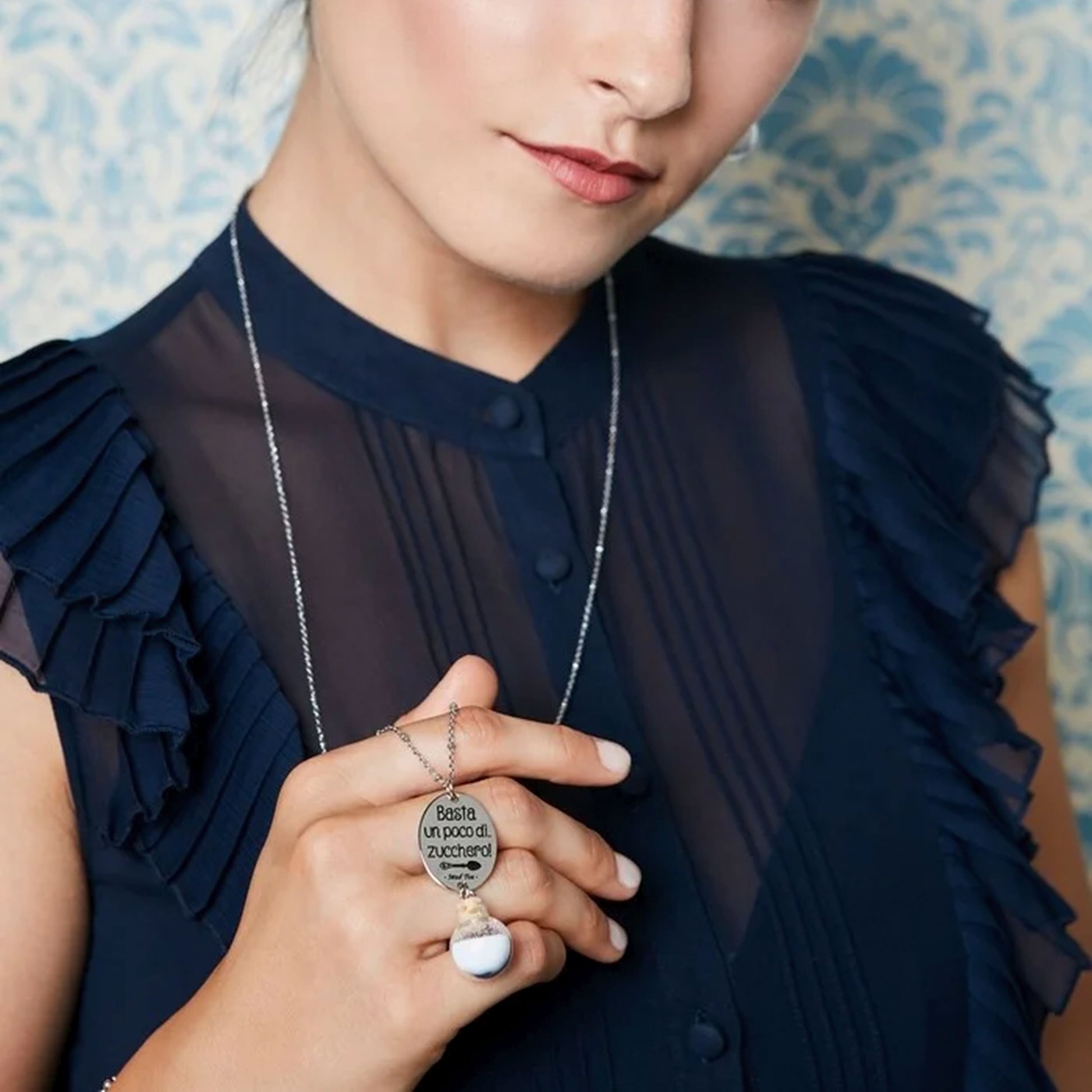 Collana composta da ciondolo con incisa la frase “Basta un poco di zucchero” e un piccolo cucchiaino inglese e una simpatica boccetta contenente lo zucchero magico.