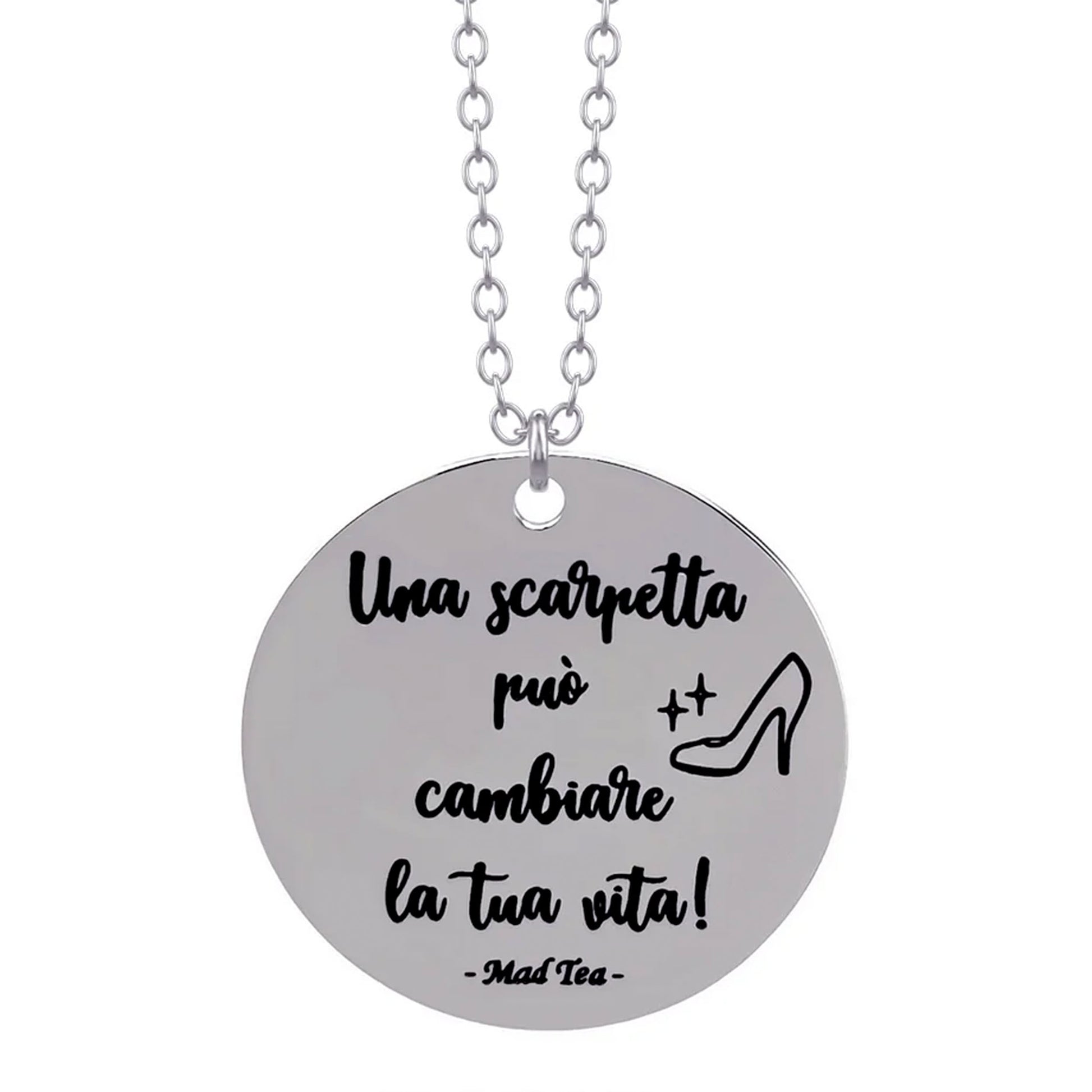 Collana con ciondolo con incisa la frase “Una scarpetta può cambiare la tua vita”.