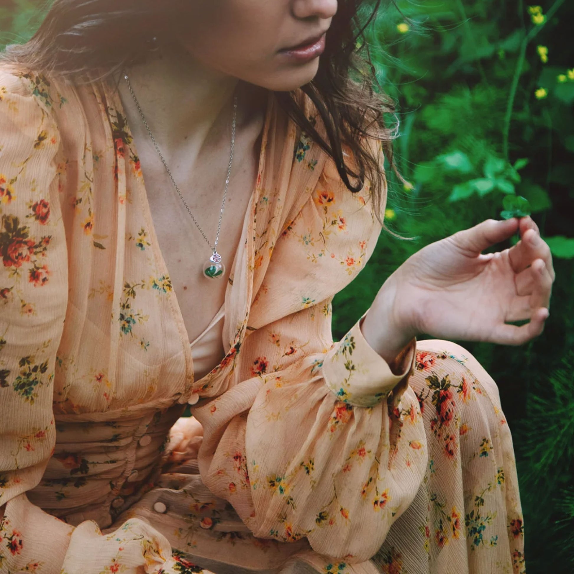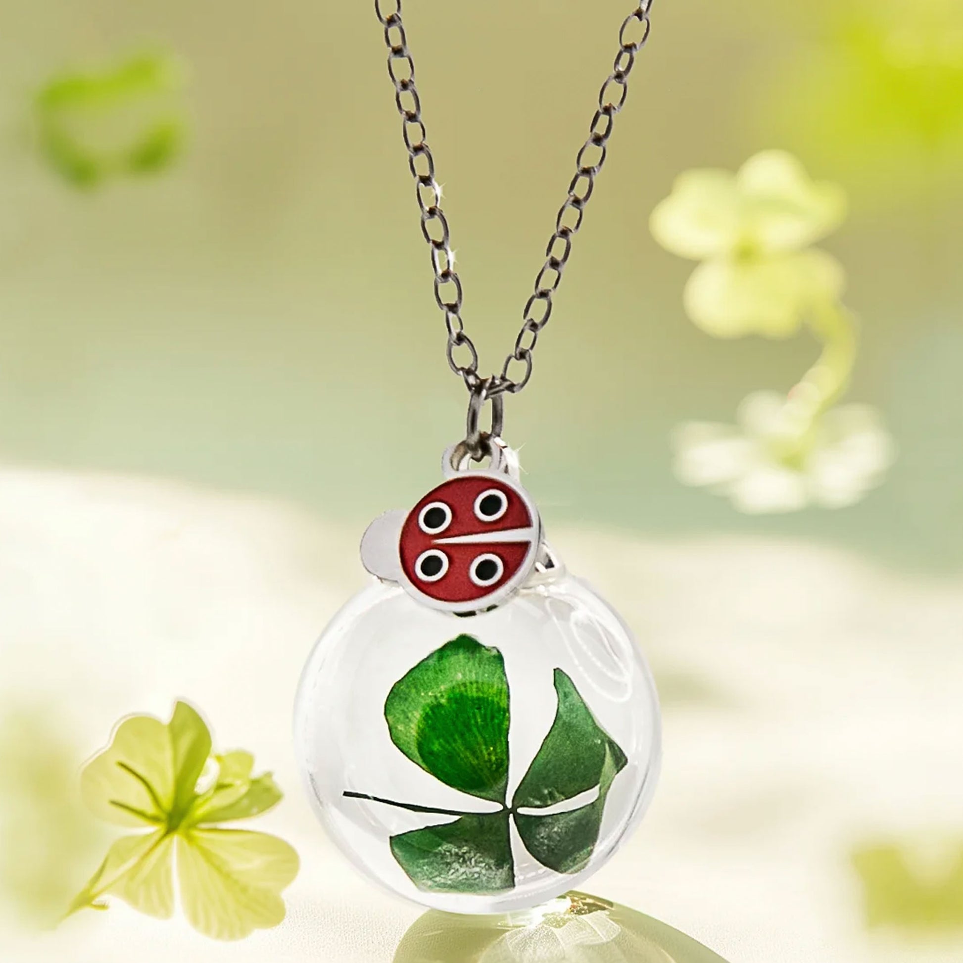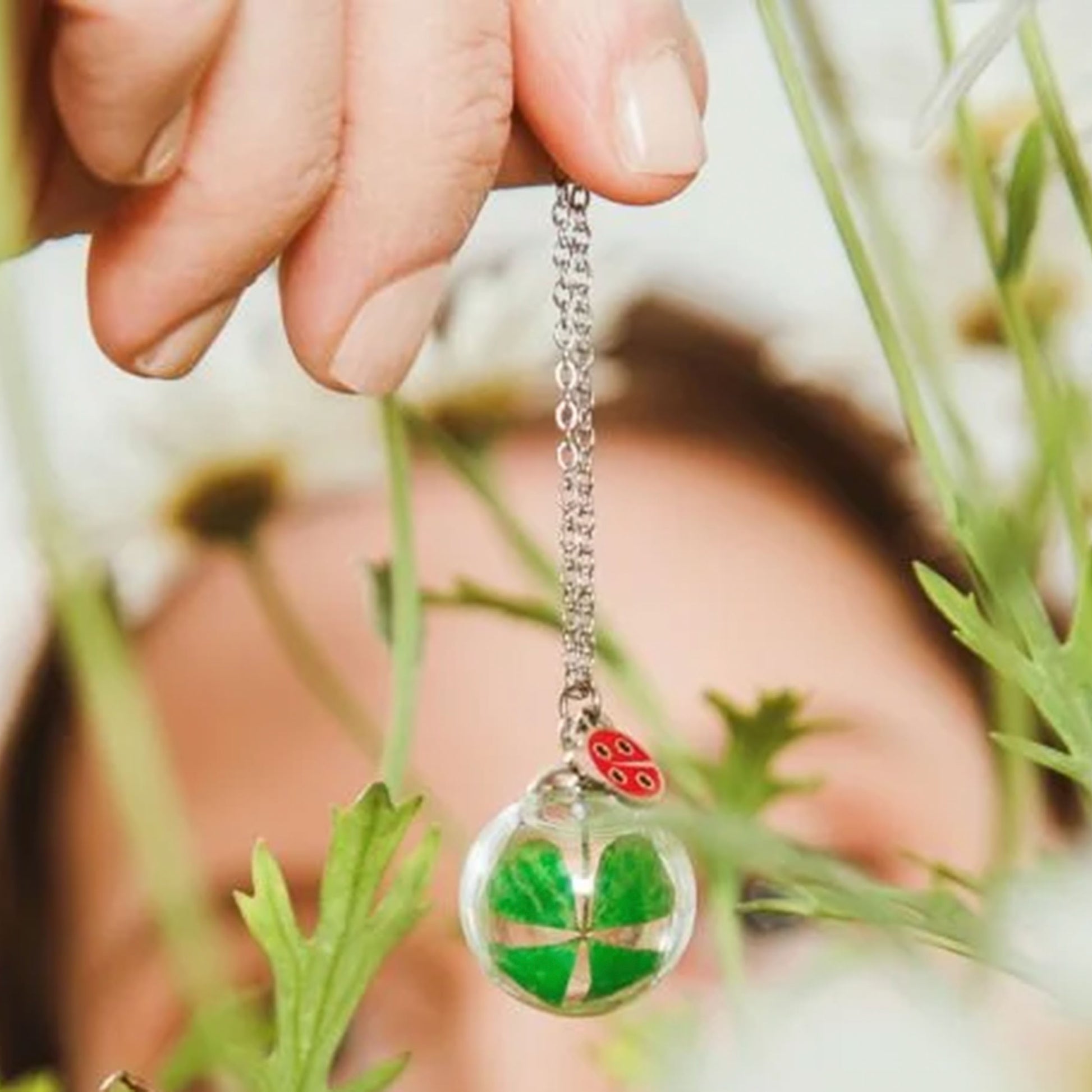 Collana con piccola sfera in vetro antiurto contenente veri quadrifogli essiccati e stabilizzati.