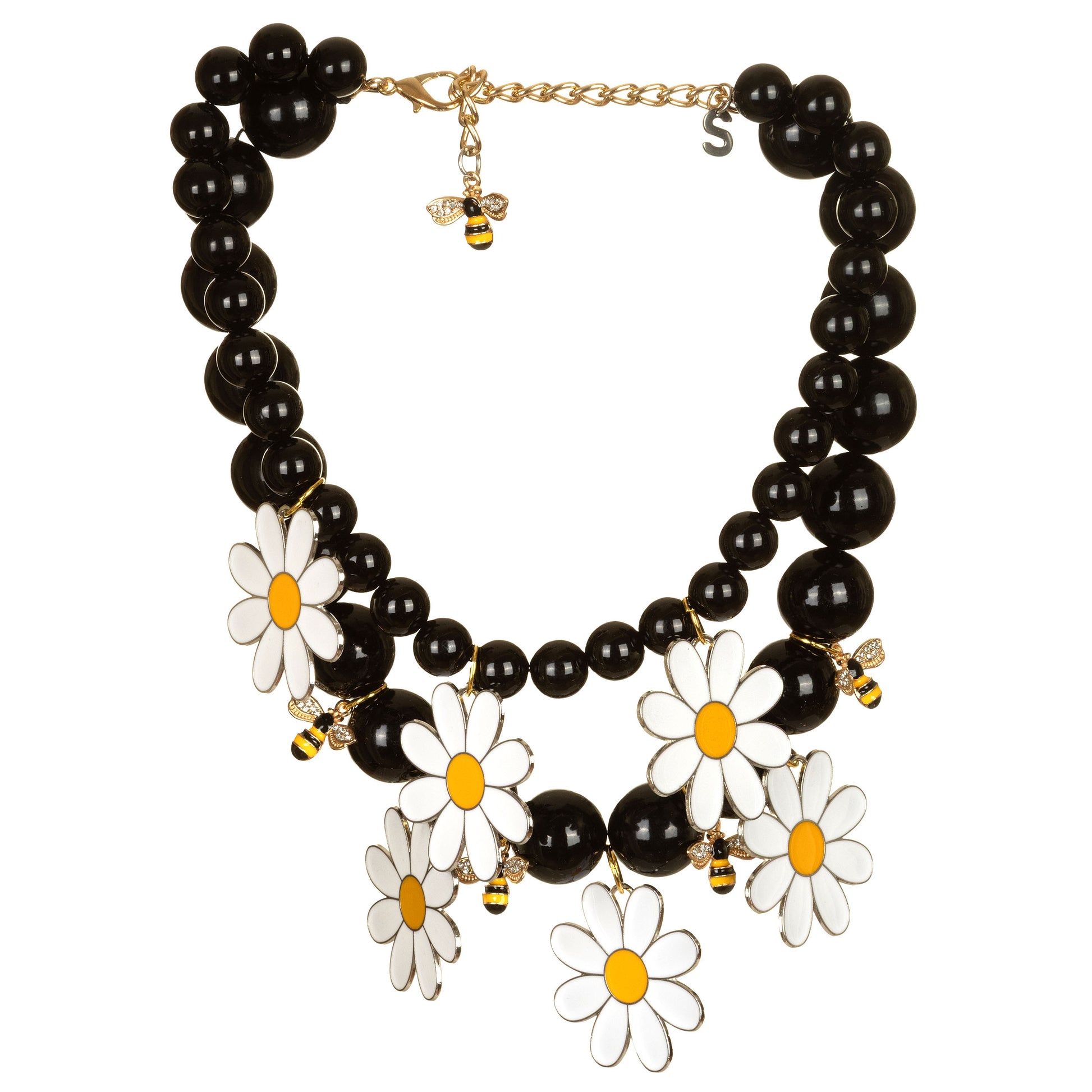 Collana girocollo doppia in pallotte in resina, con margherite in metallo smaltato, e api.