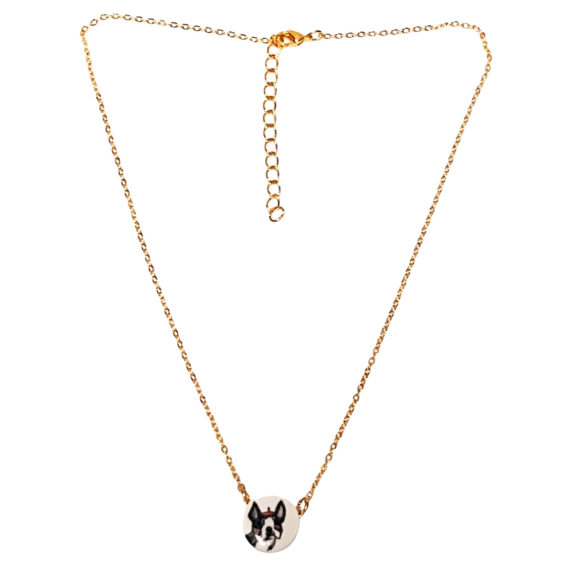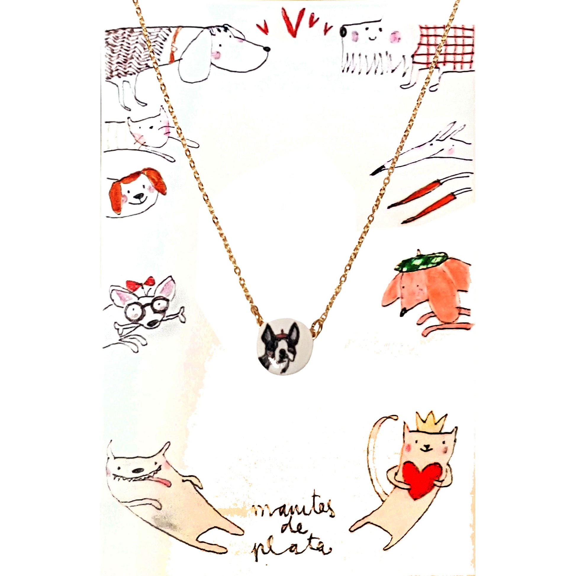 Girocollo MANITAS DE PLATA con disegno Bulldog, dipinto a mano. [LF]Catena placcato oro, anallergica, con piastra realizzata in ceramica fredda. Dimensioni 1.5 cm x 1.5 cm. Lunghezza catena cm. 45. [LF]Cura: togli la collana per fare il bagno o la doccia, durerà molto più a lungo in perfette condizioni. 100% Hand Made in Spain