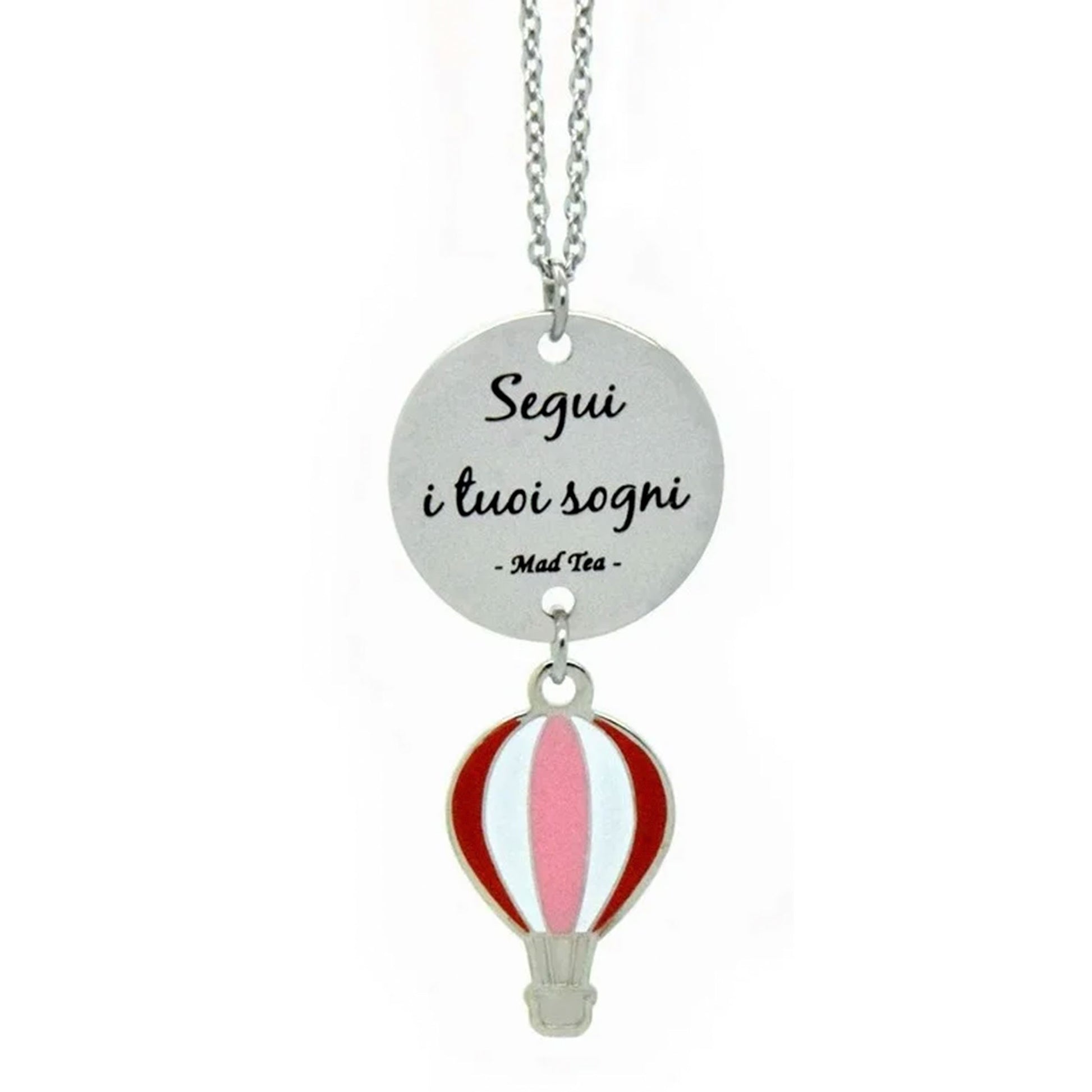 Collana con dolce mongolfiera colorata e targhetta con incisa la frase “Segui i tuoi sogni”.