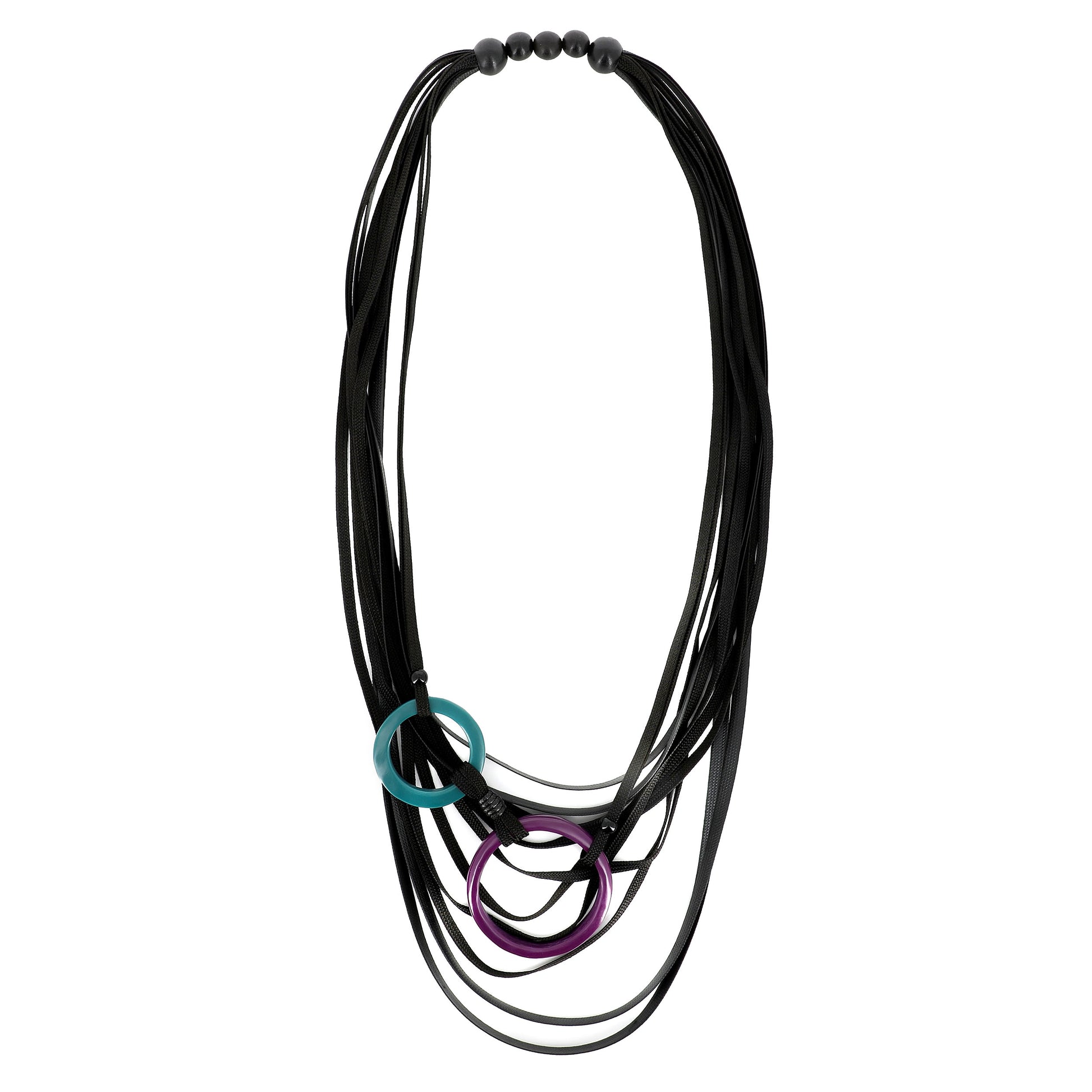 Collana, a lunghezza fissa, in spessa corda morbida, multifilo, con anelli in resina lucida di diverse dimensioni.