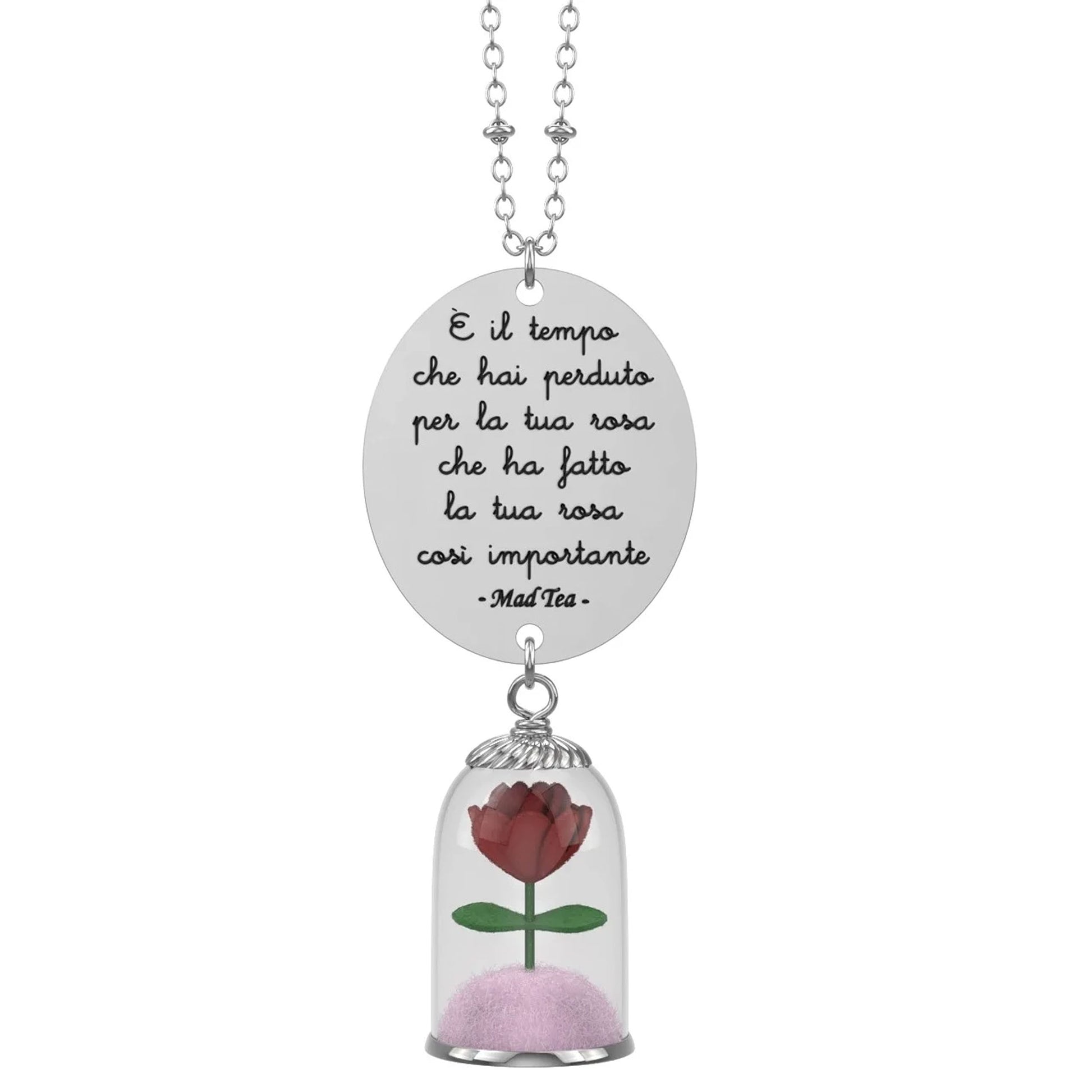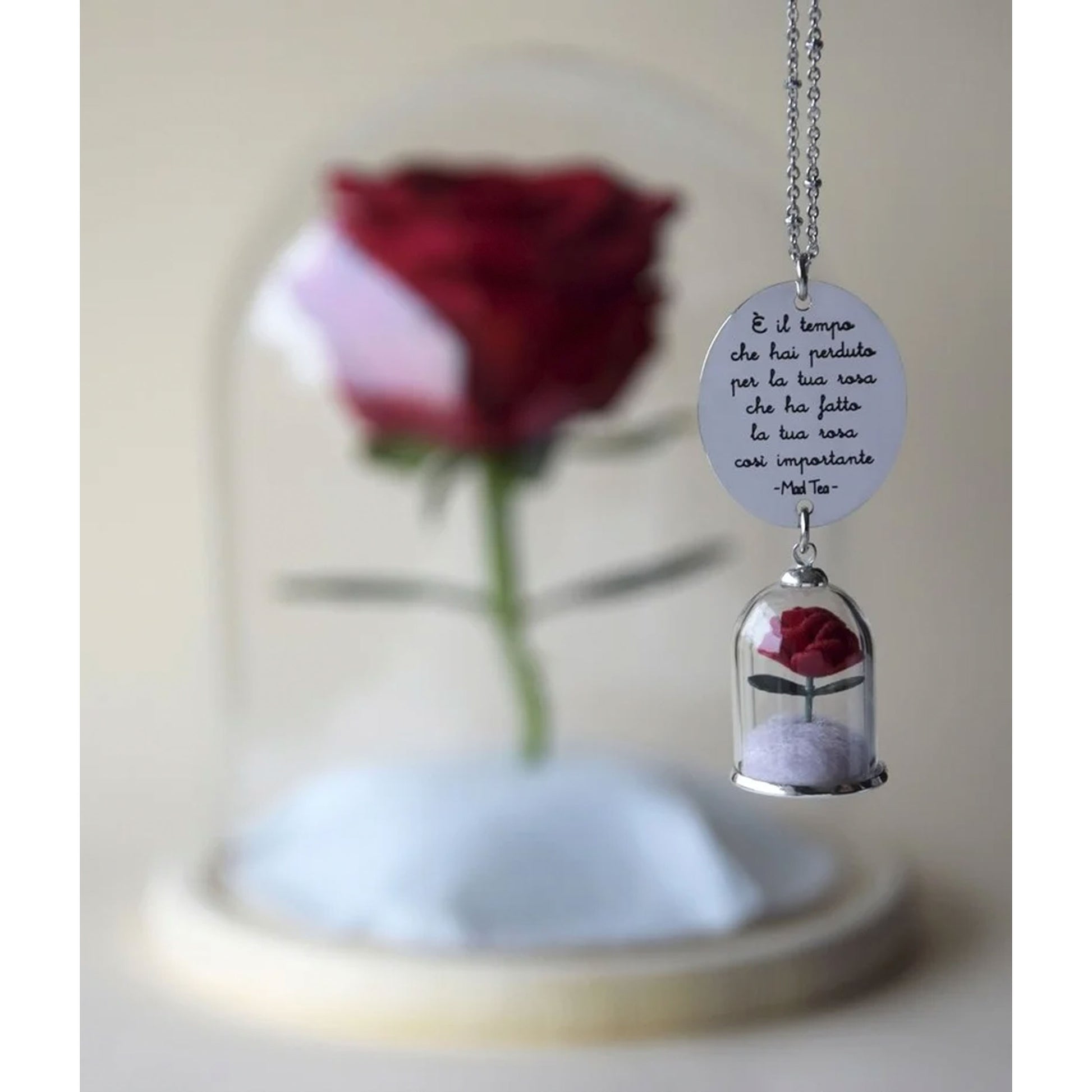 Collana con rosa del Piccolo Principe contenuta in una campana di vetro e targhetta con incisa la frase “È il tempo che hai perduto per la tua rosa che ha fatto la tua rosa così importante”. Catena a rosario.