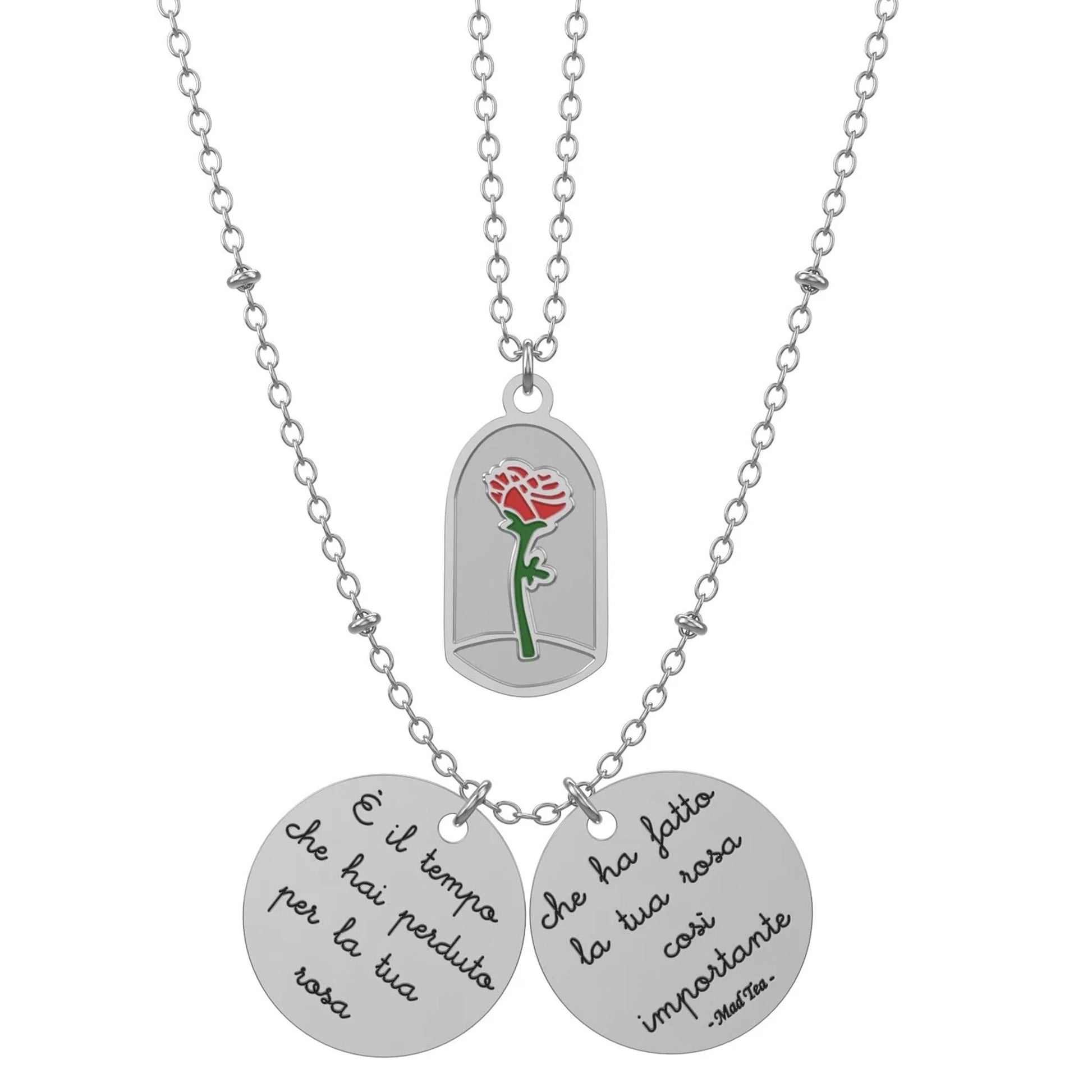 Collana composta da set di due collane singole con la rosa del Piccolo Principe in una e due ciondoli con incisa la frase “È il tempo che hai perduto per la tua rosa che ha fatto la tua rosa così importante” nell’altra.