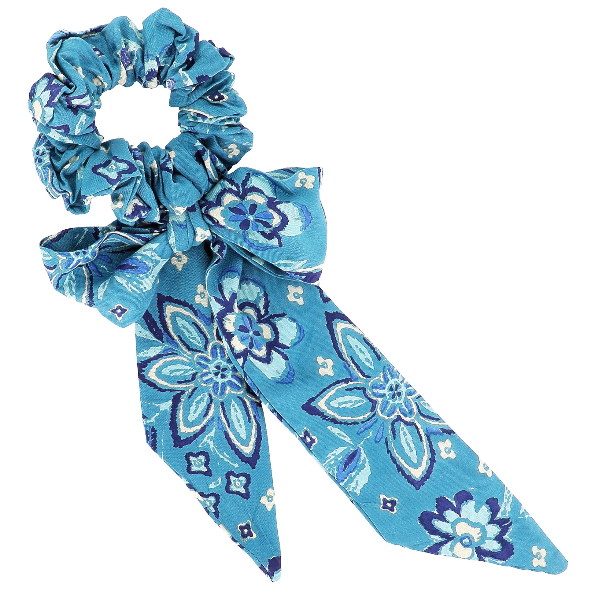 Elastico per capelli in rayon stampato con fiocco removibile. Composizione: 100% rayon. Provenienza: India. Lavare a 40°.