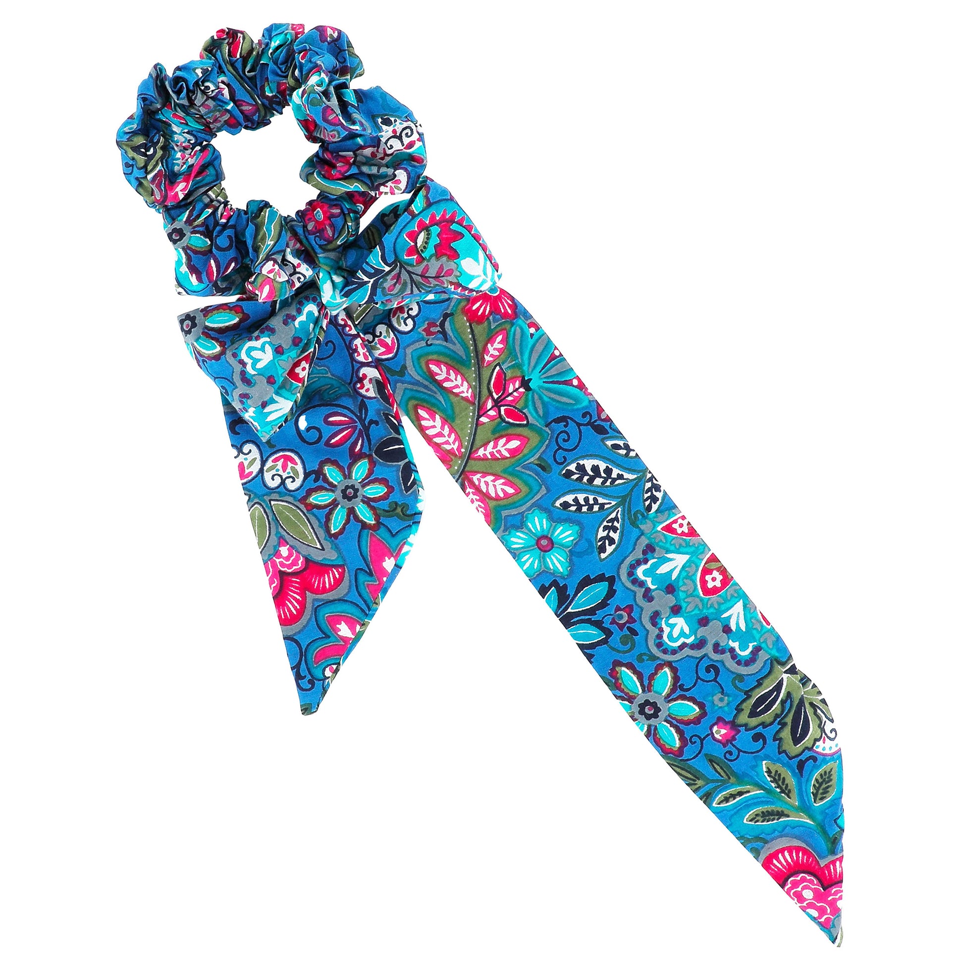 Elastico per capelli in rayon stampato con fiocco removibile. Composizione: 100% rayon. Provenienza: India. Lavare a 40°.