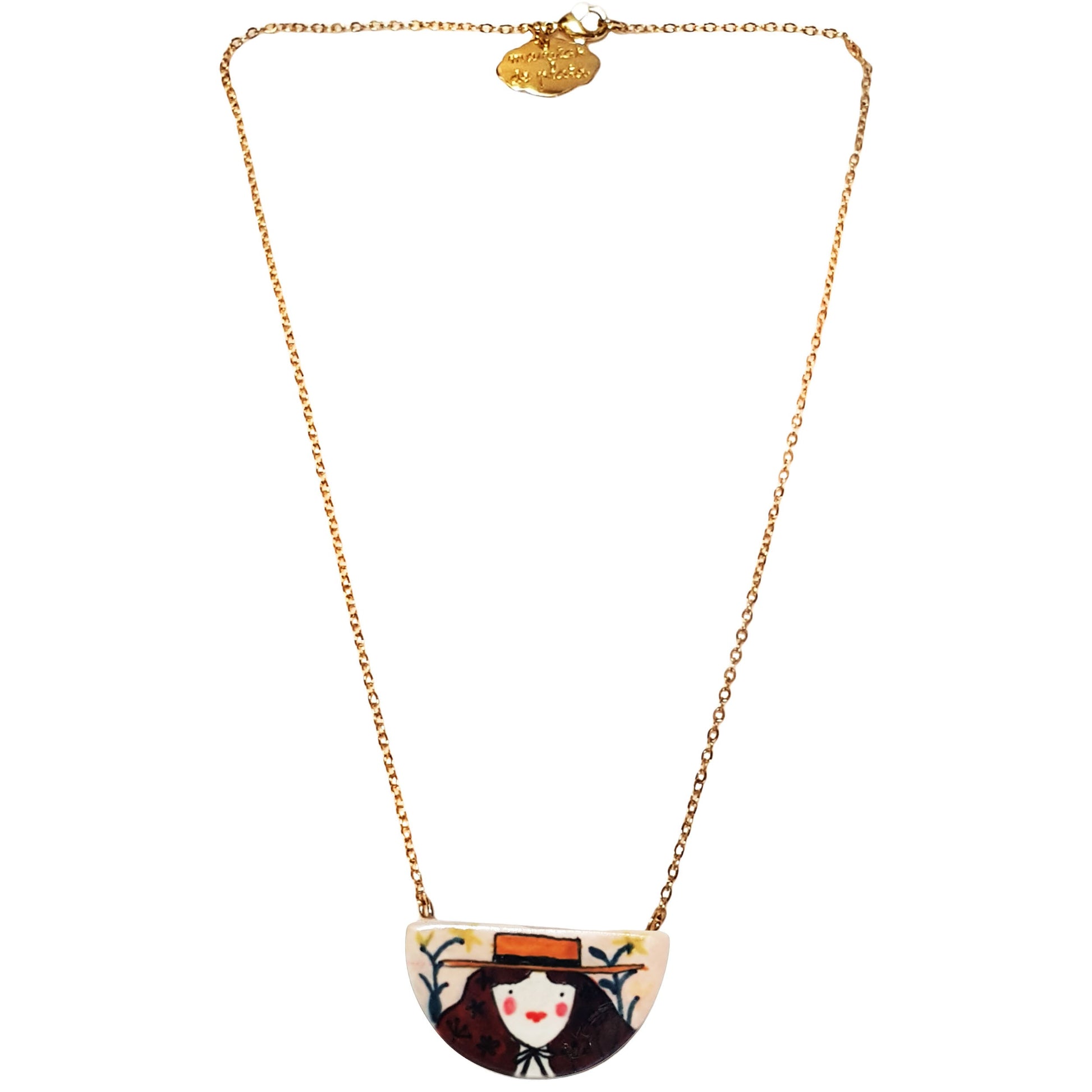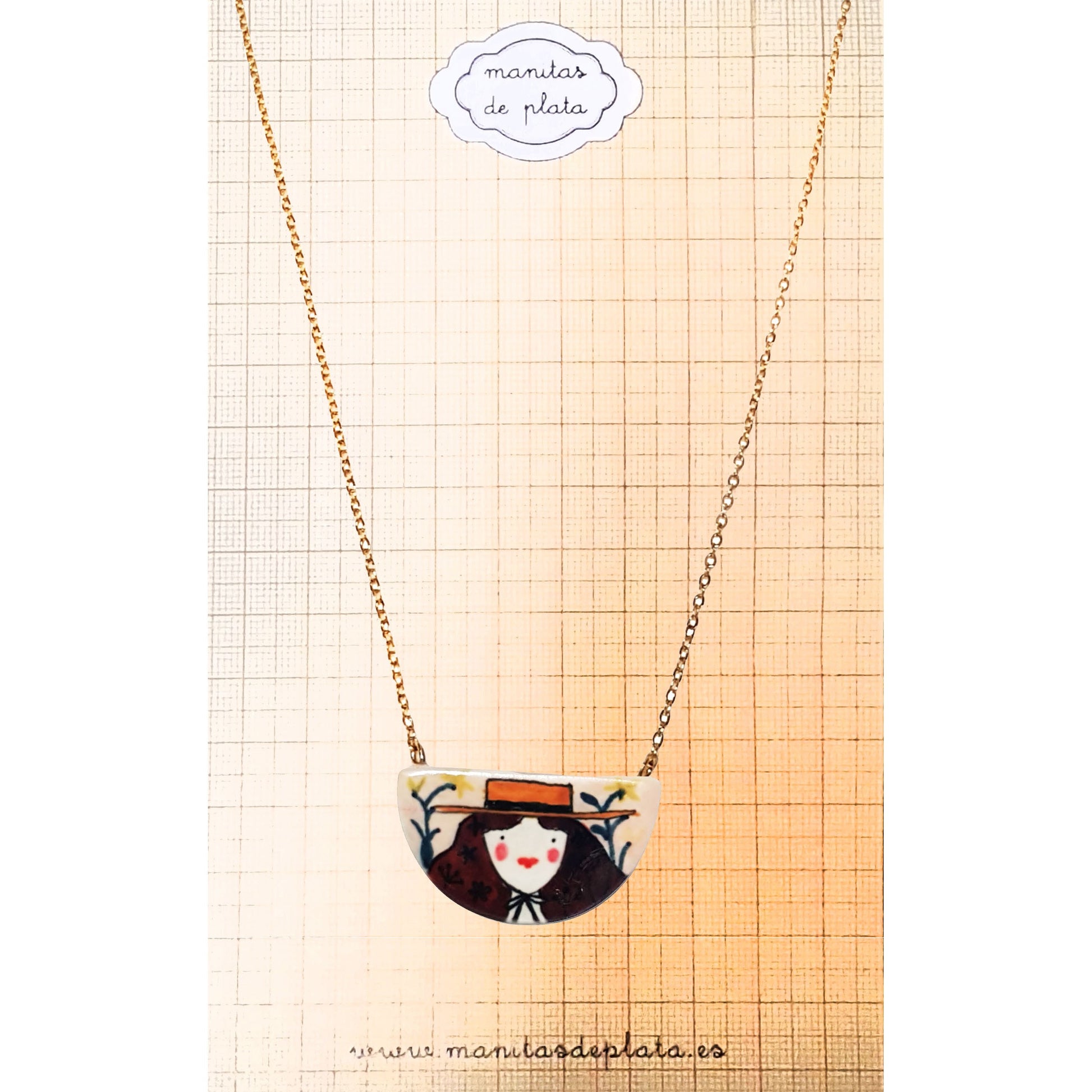 Girocollo mezzaluna Chica sombrero MANITAS DE PLATA, dipinto a mano. [LF]Catena placcato rodio, anallergica, con piastra realizzata in ceramica fredda. Dimensioni 3 cm x 2 cm. Lunghezza catena cm. 40. [LF]Cura: togli la collana per fare il bagno o la doccia, durerà molto più a lungo in perfette condizioni. 100% Hand Made in Spain