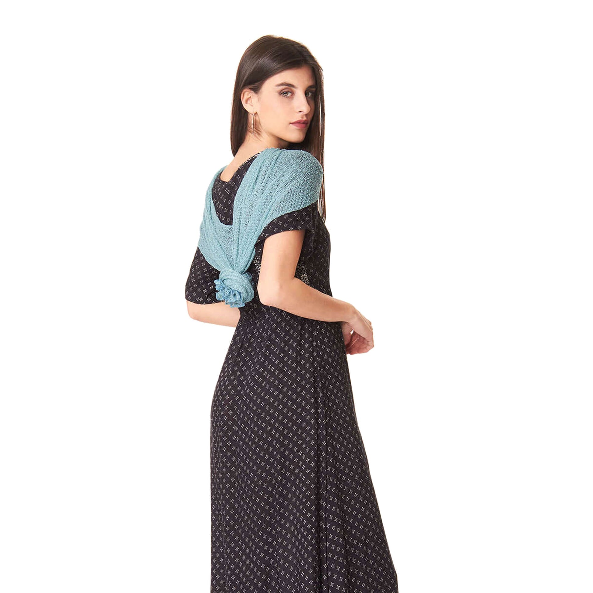 Un capo versatile da indossare aperto, come maxi scialle, annodato dietro come top.