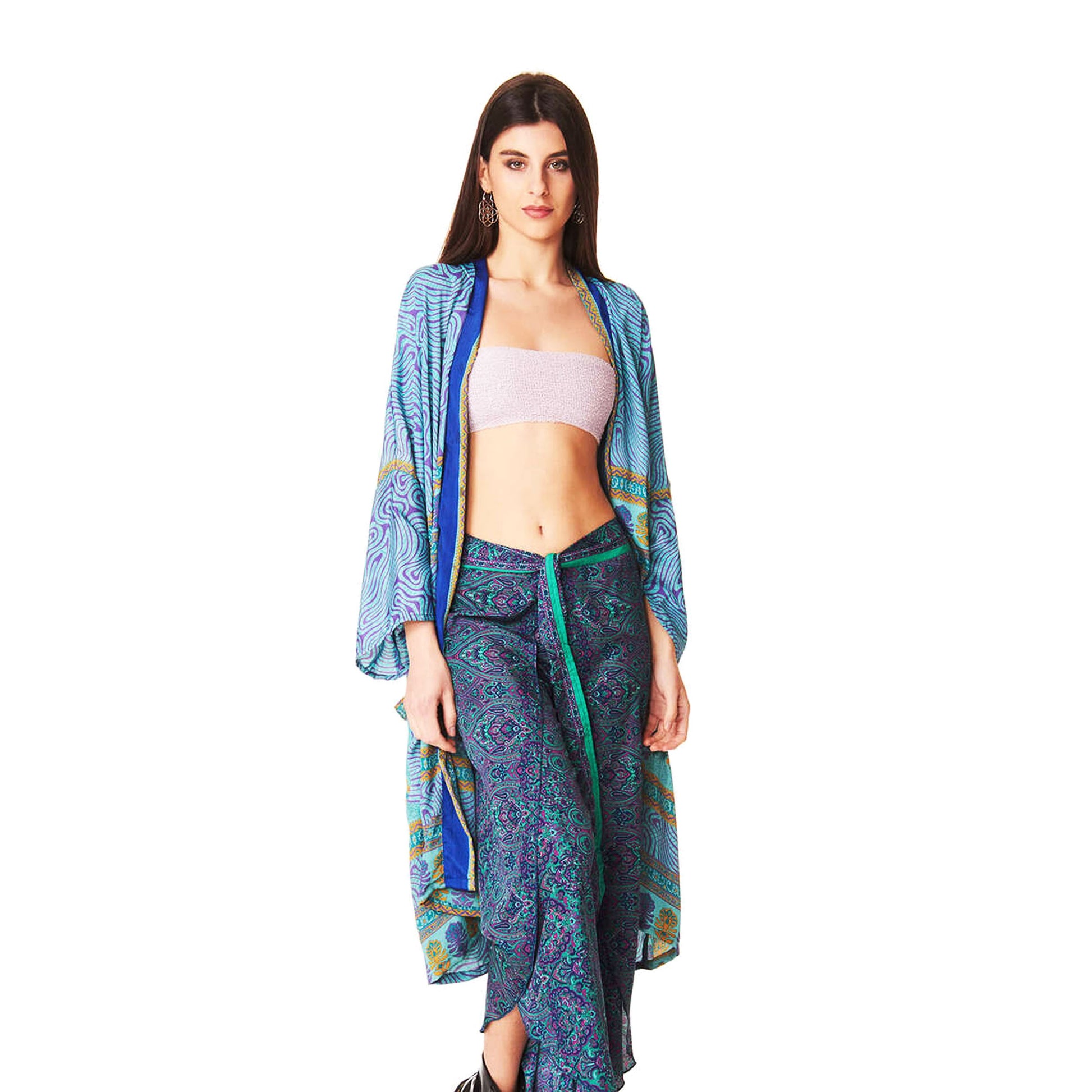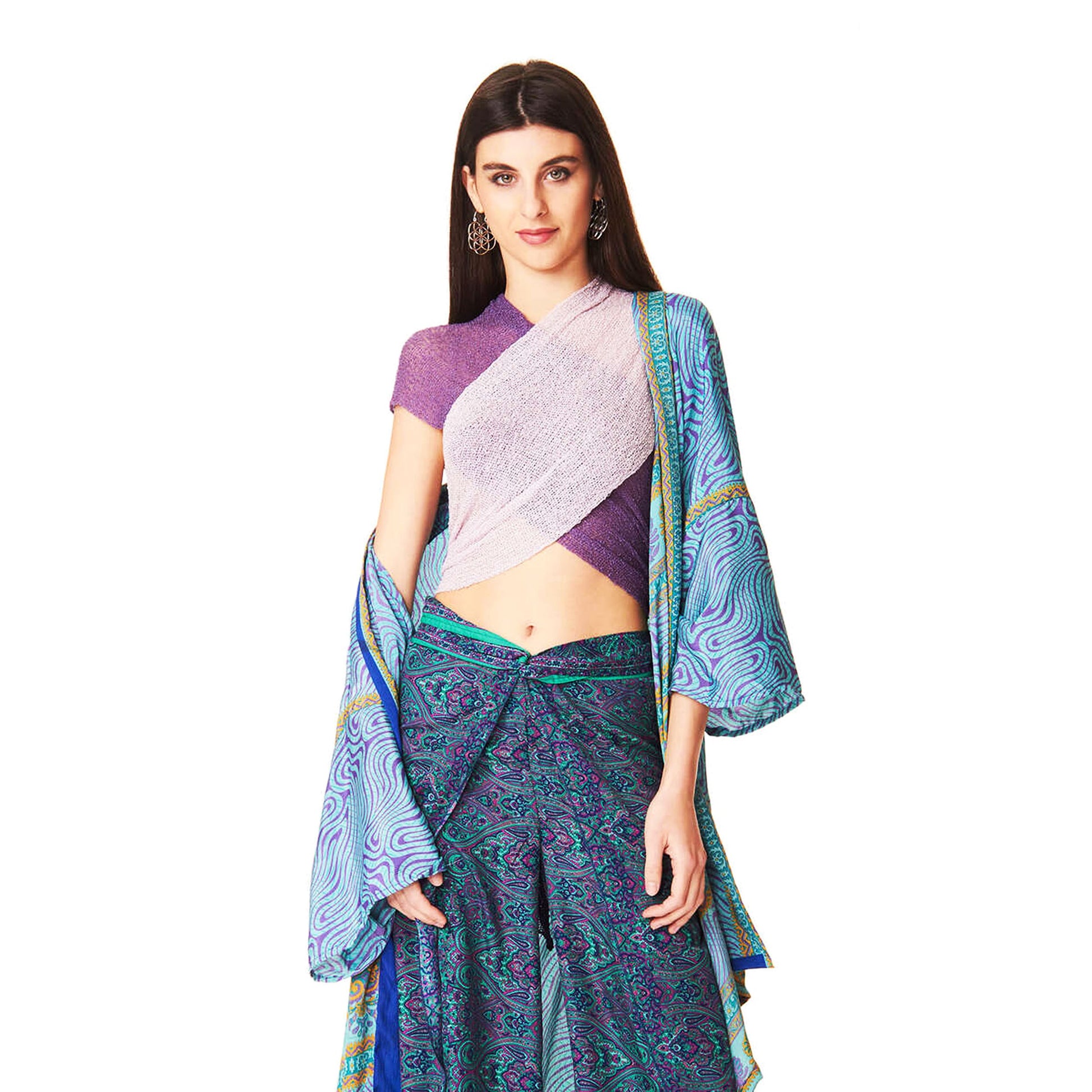 Un capo versatile da indossare aperto, come maxi scialle, annodato dietro come top.