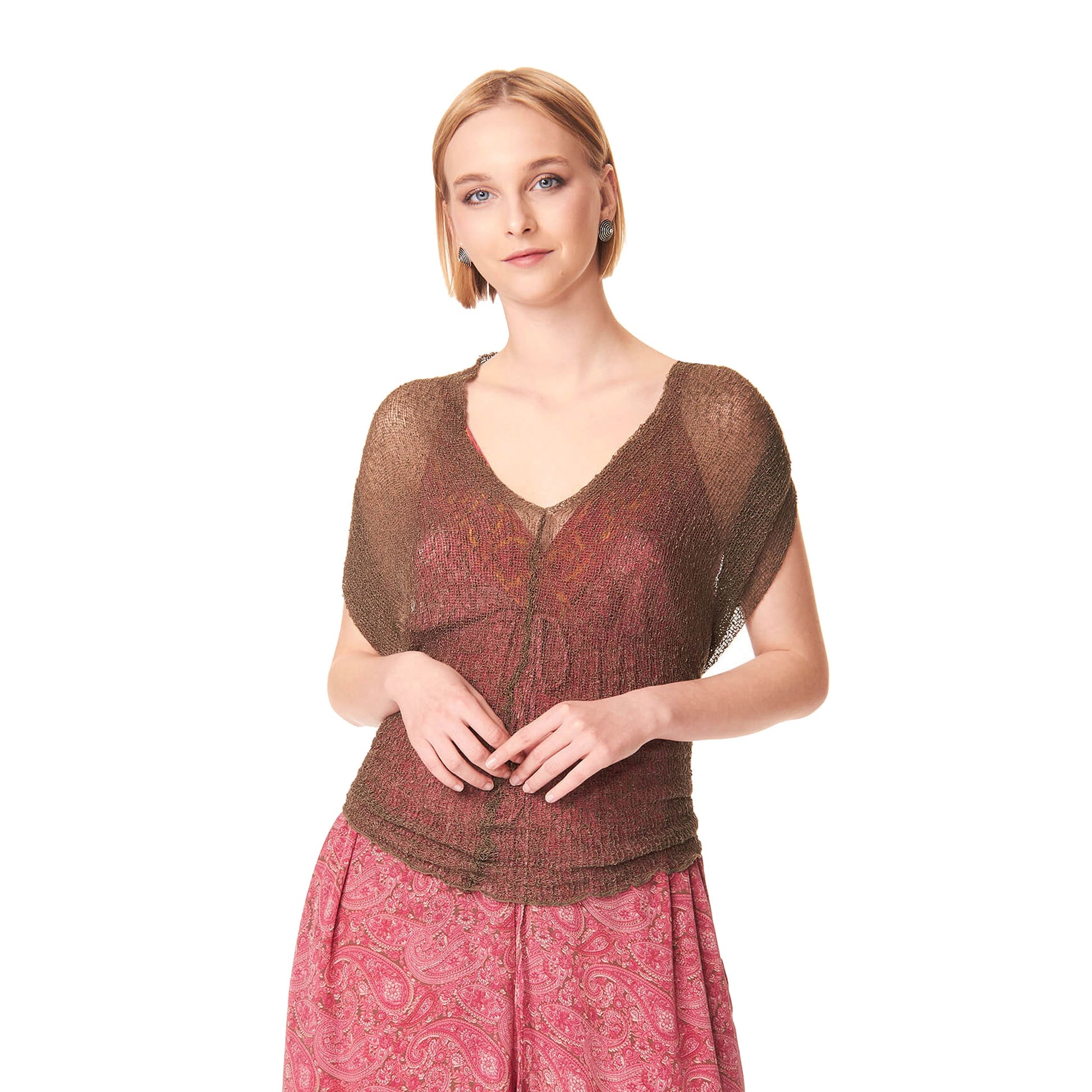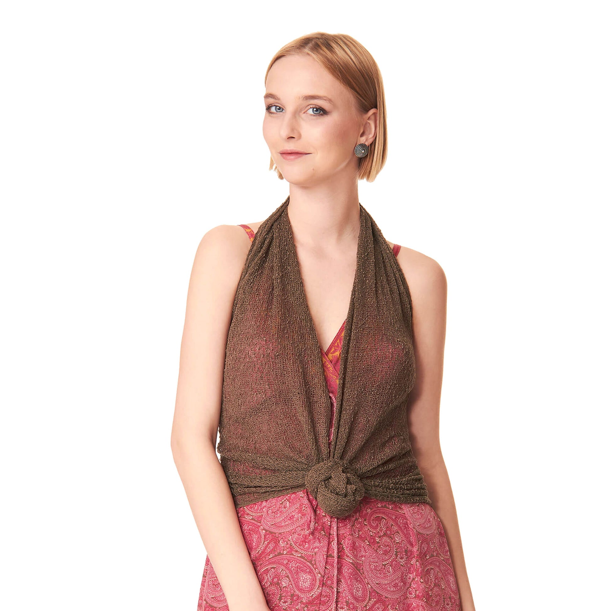 Un capo versatile da indossare aperto, come maxi scialle, annodato dietro come top.