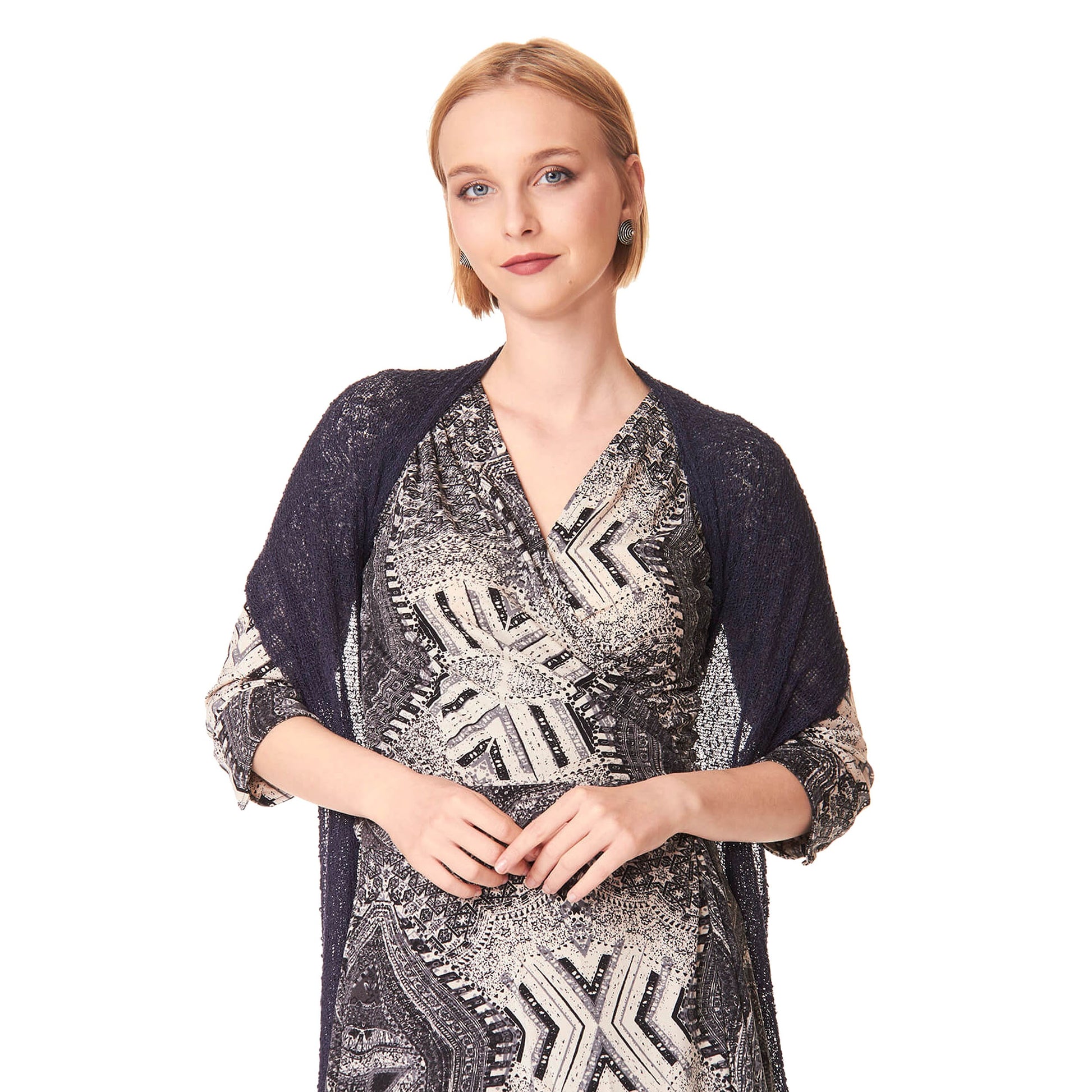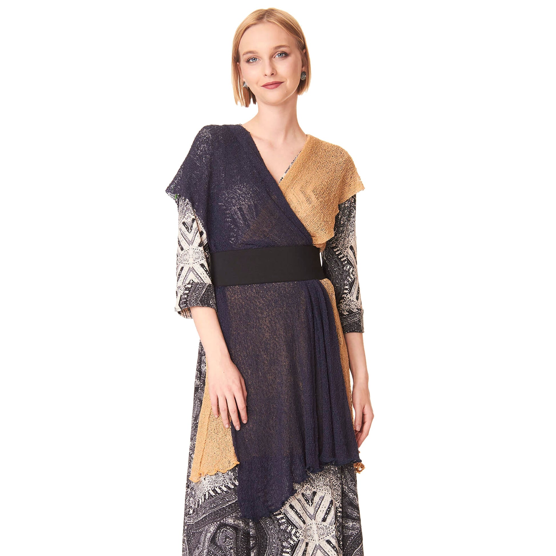 Un capo versatile da indossare aperto, come maxi scialle, annodato dietro come top.