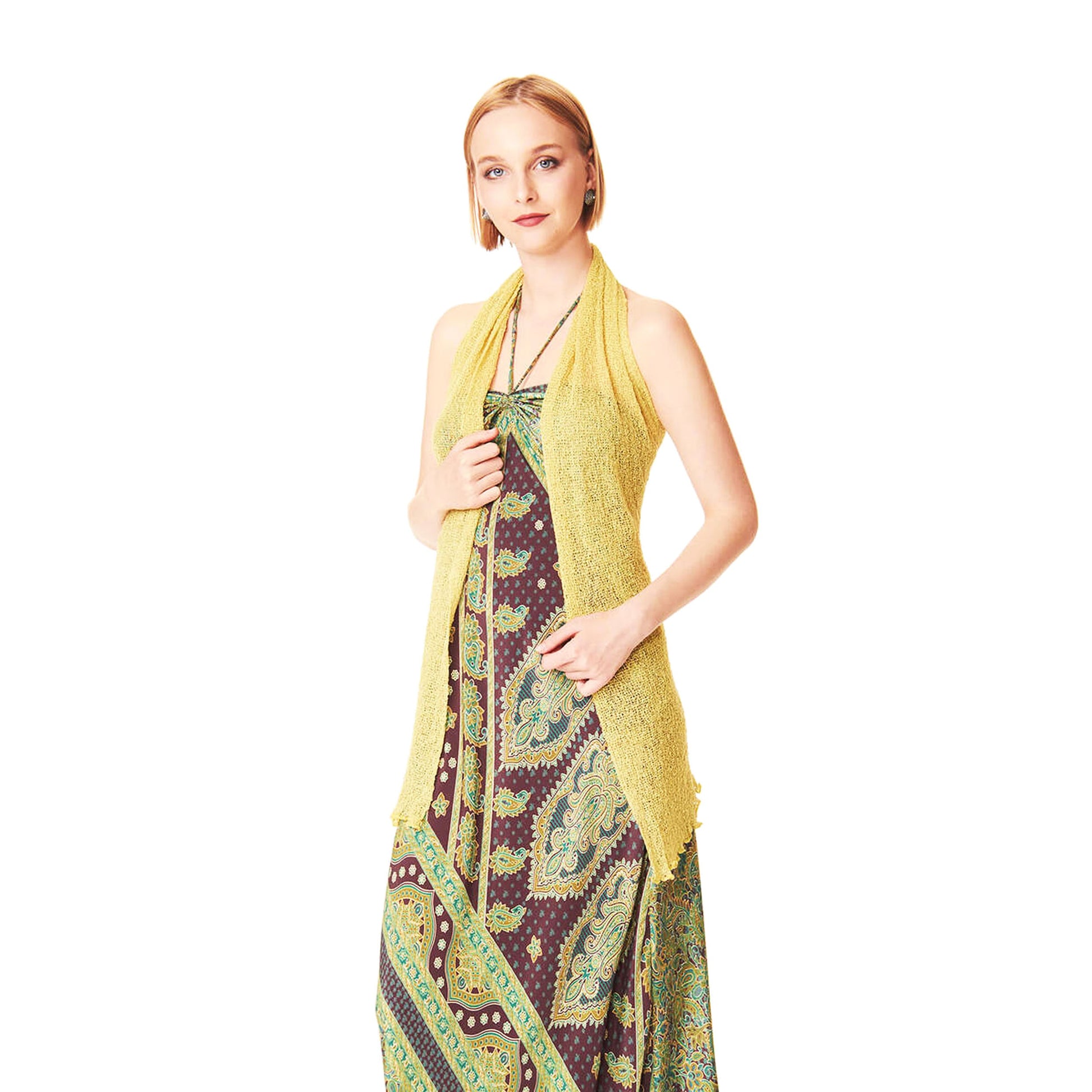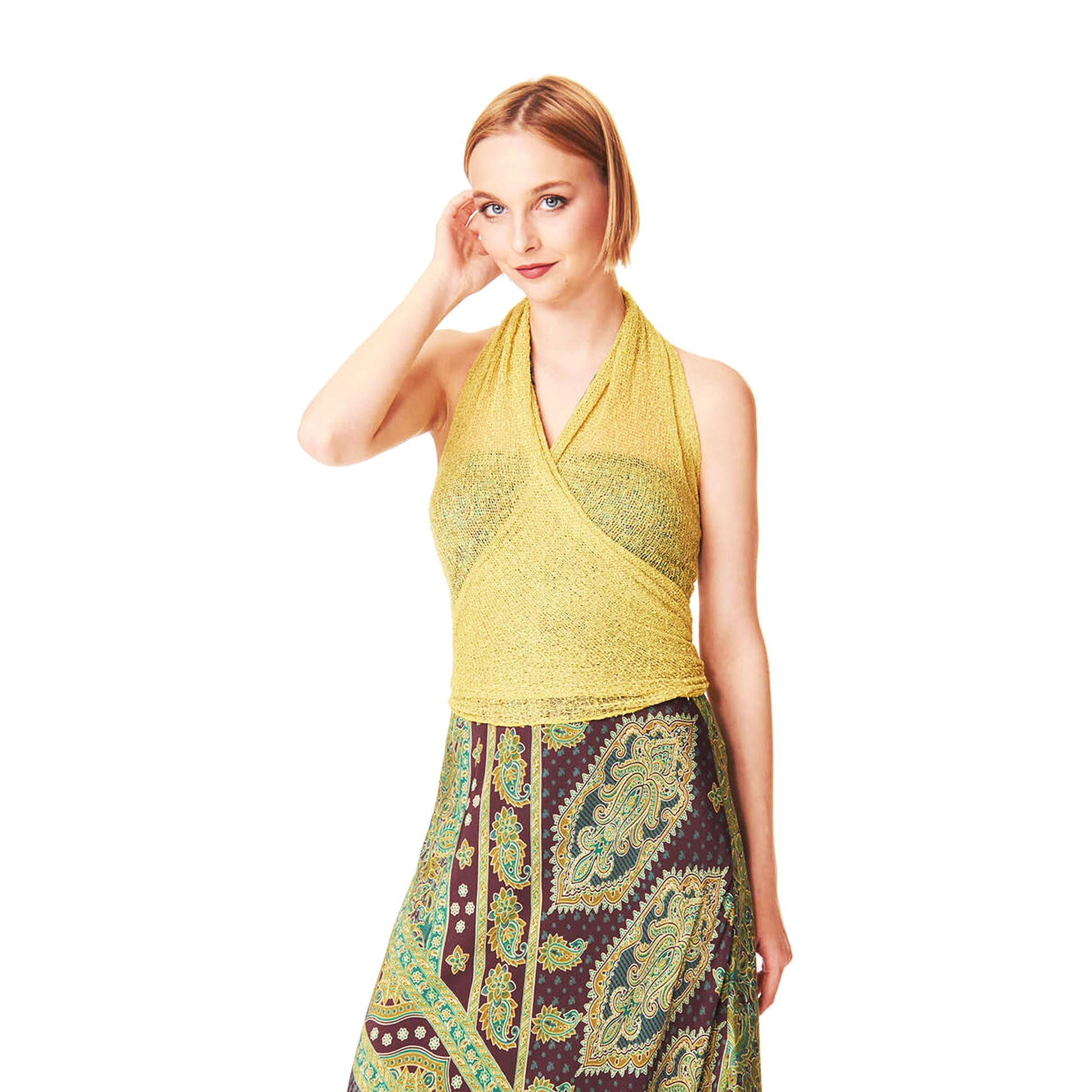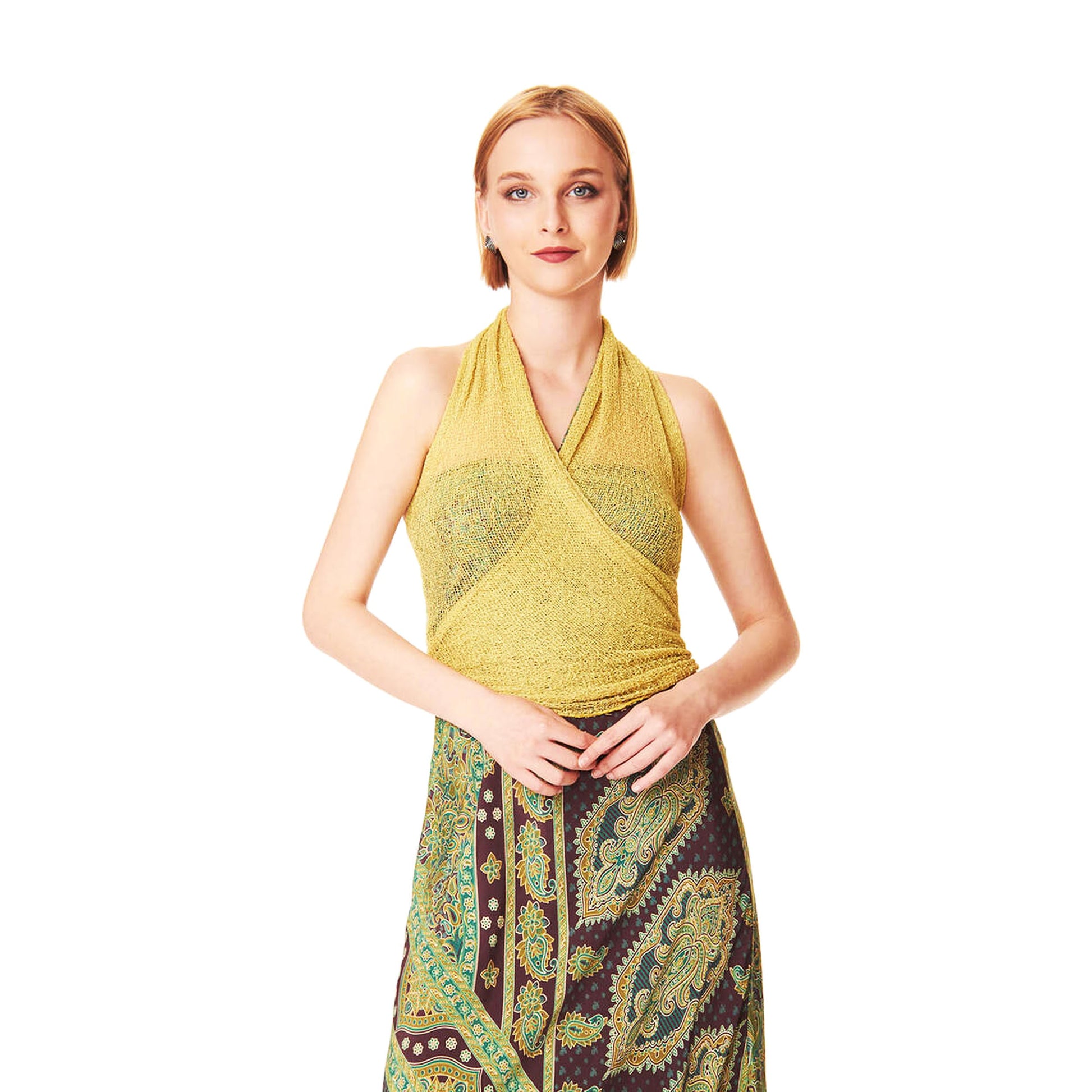 Un capo versatile da indossare aperto, come maxi scialle, annodato dietro come top.