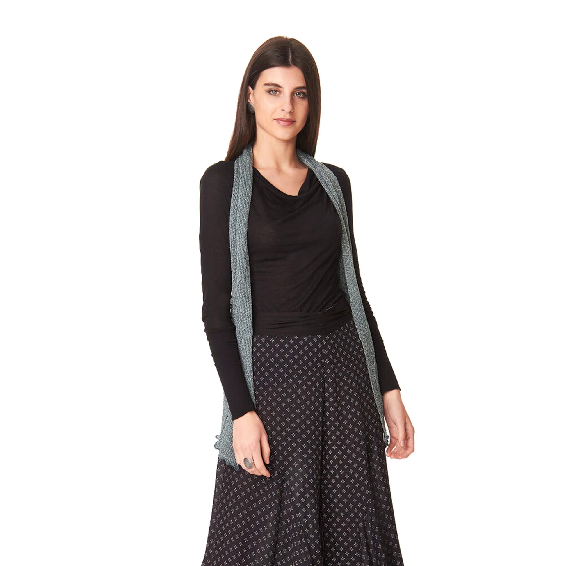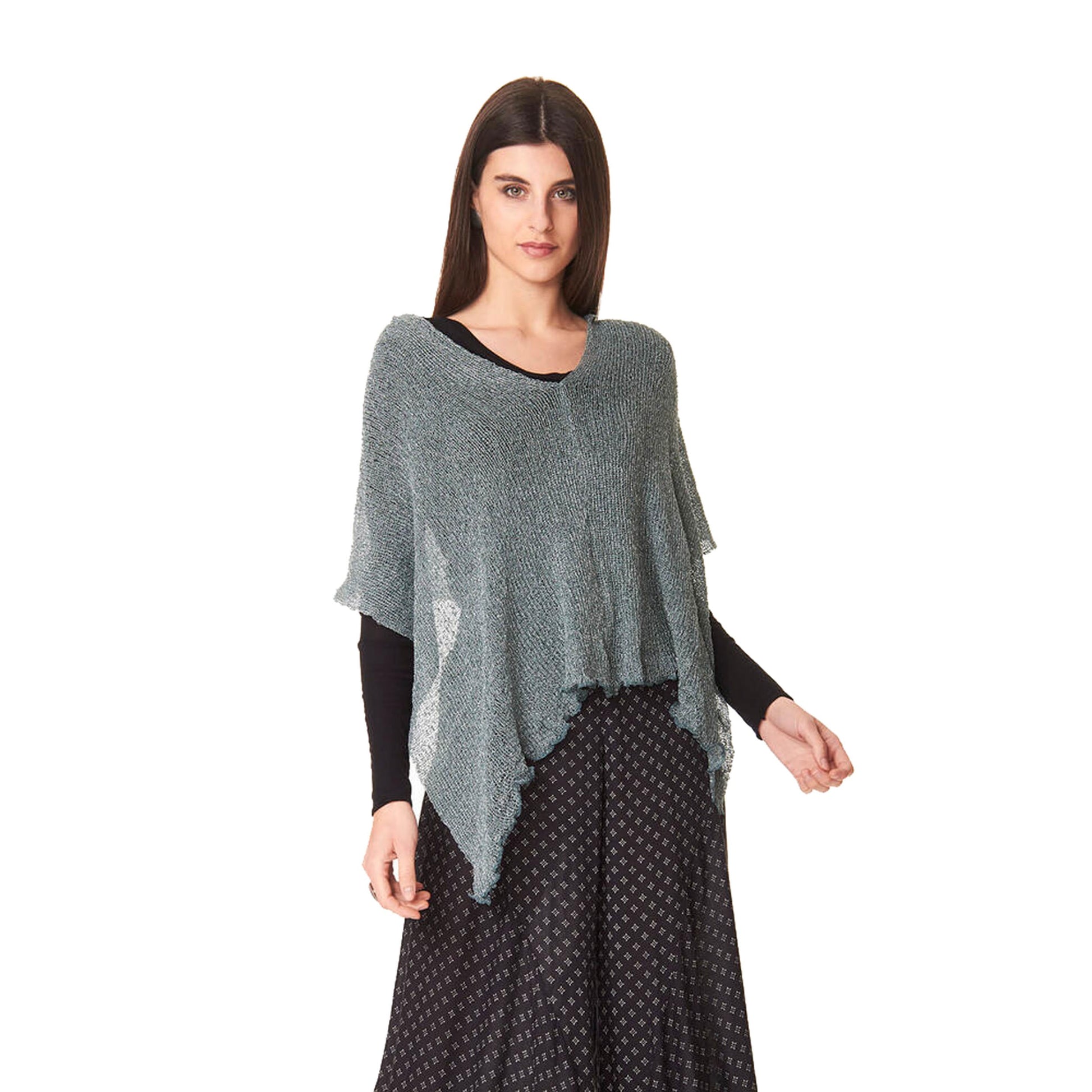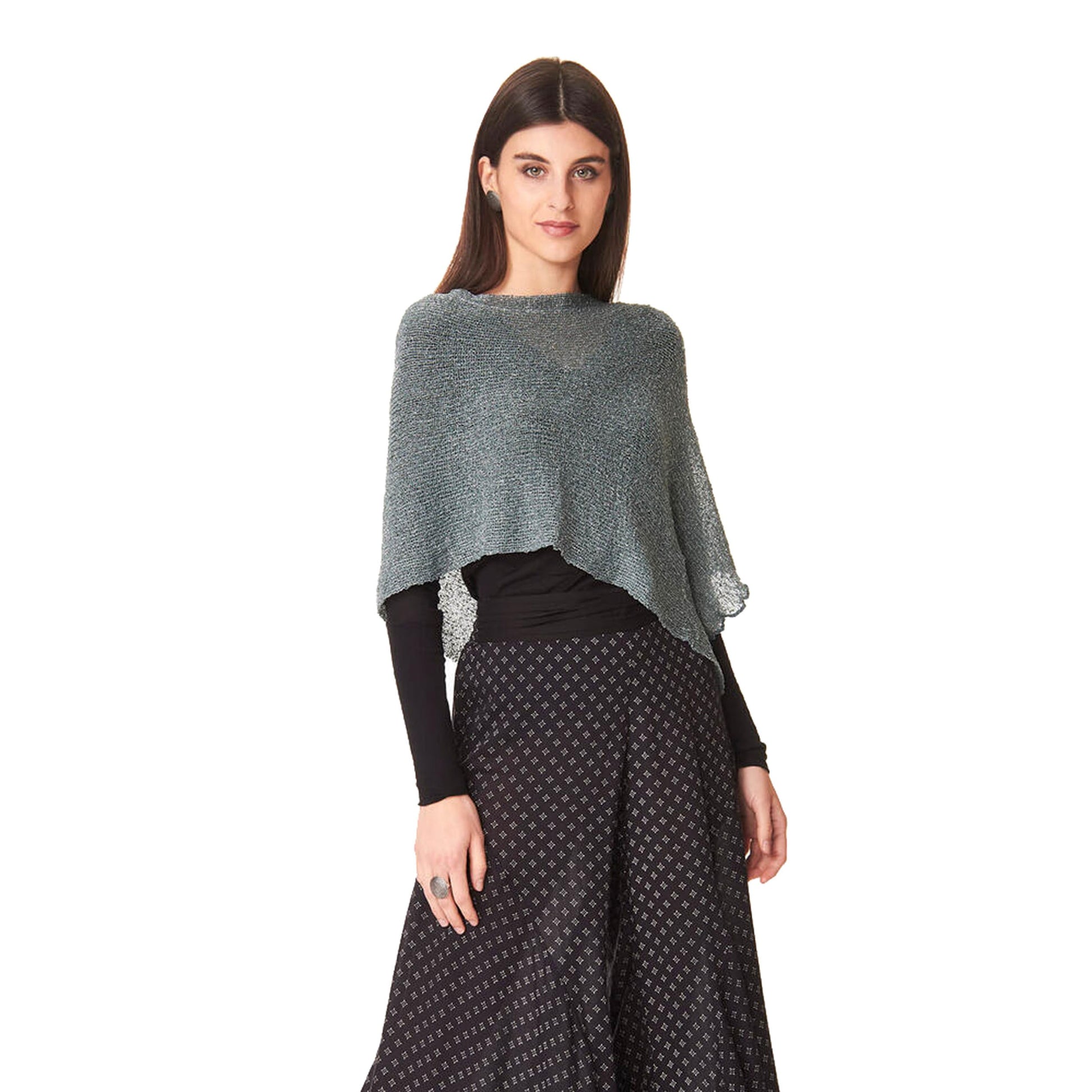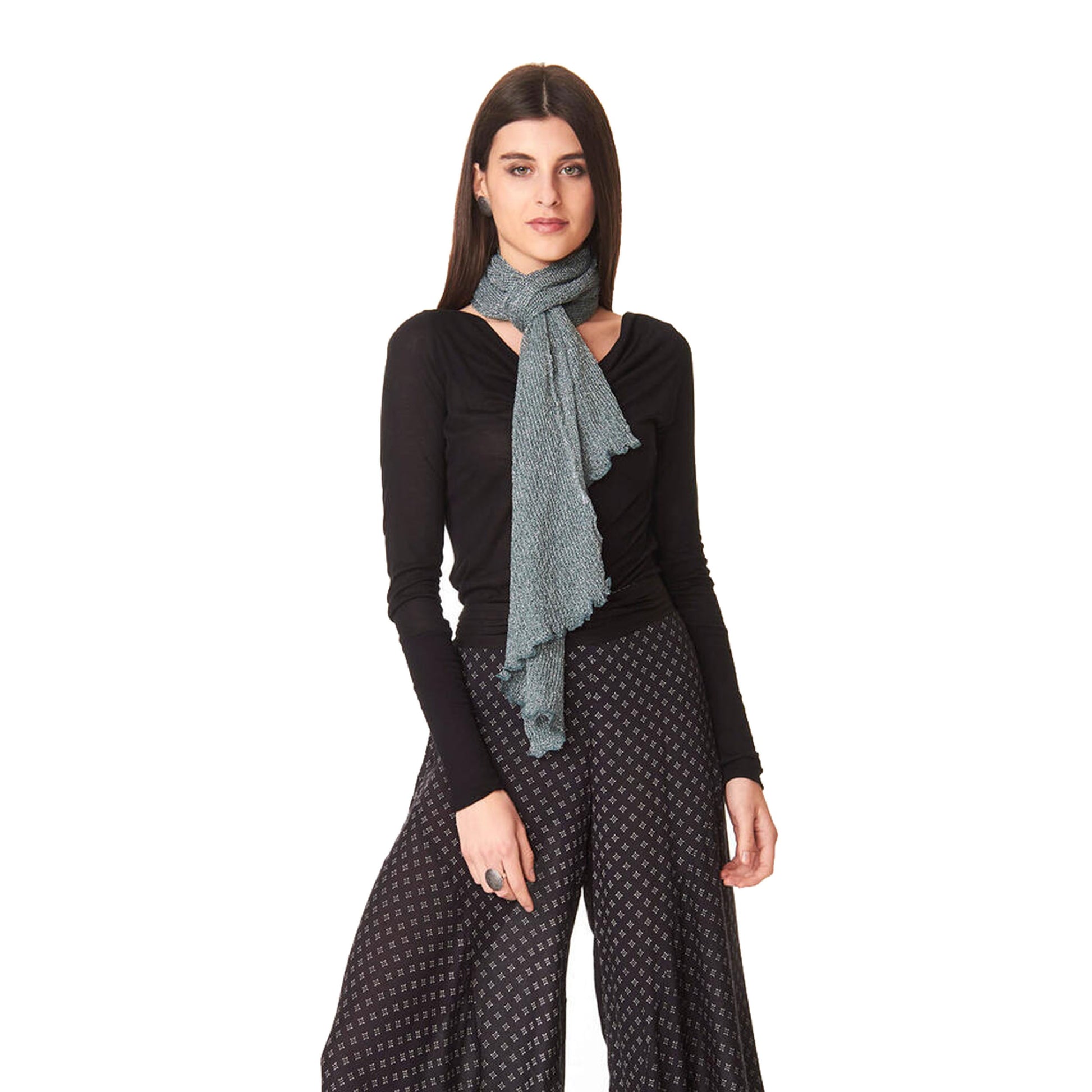 Maxi scialle in tessuto rayon con inserti lurex argento. Morbido, semitrasparente, e dalla texture leggera e retata.