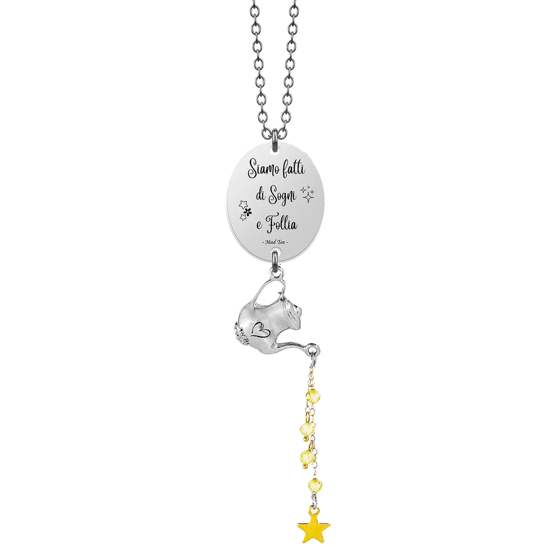 Collana con ciondolo composto da targhetta con incisa la frase “Siamo fatti di Sogni e Follia” e una piccola teiera che versa un tè fatto di cristalli dorati con una piccola stellina finale pendente.